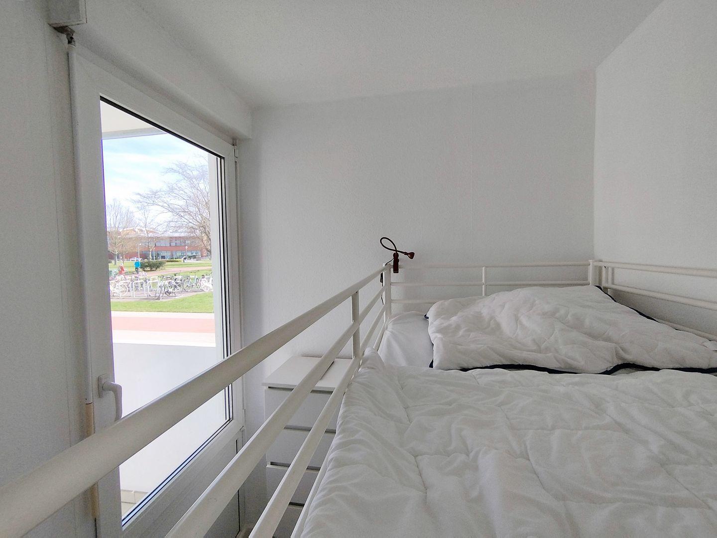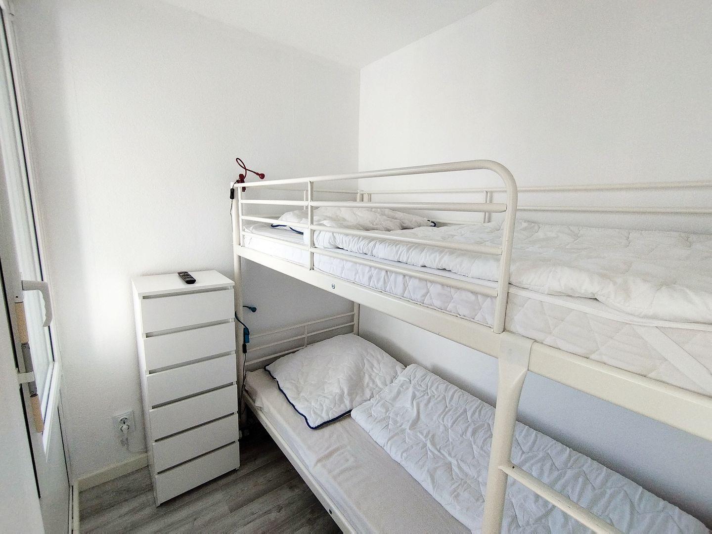 Der separate Schlafbereich ist mit einem Doppelbett, das separate Kinderzimmer ist mit Etagenbett und TV ausgestattet