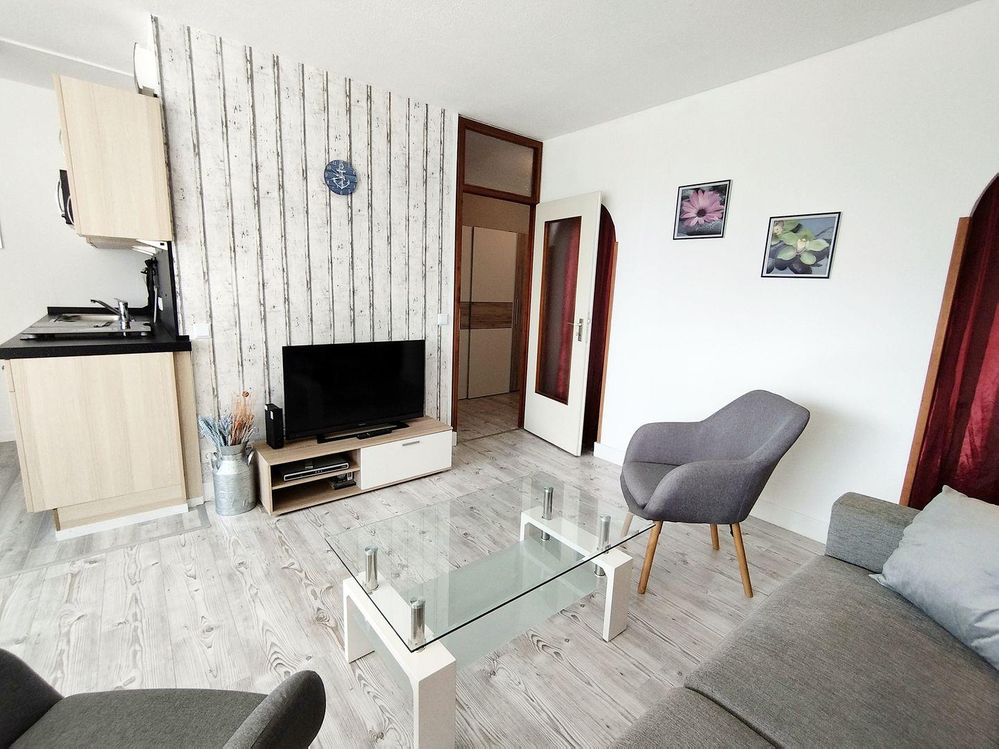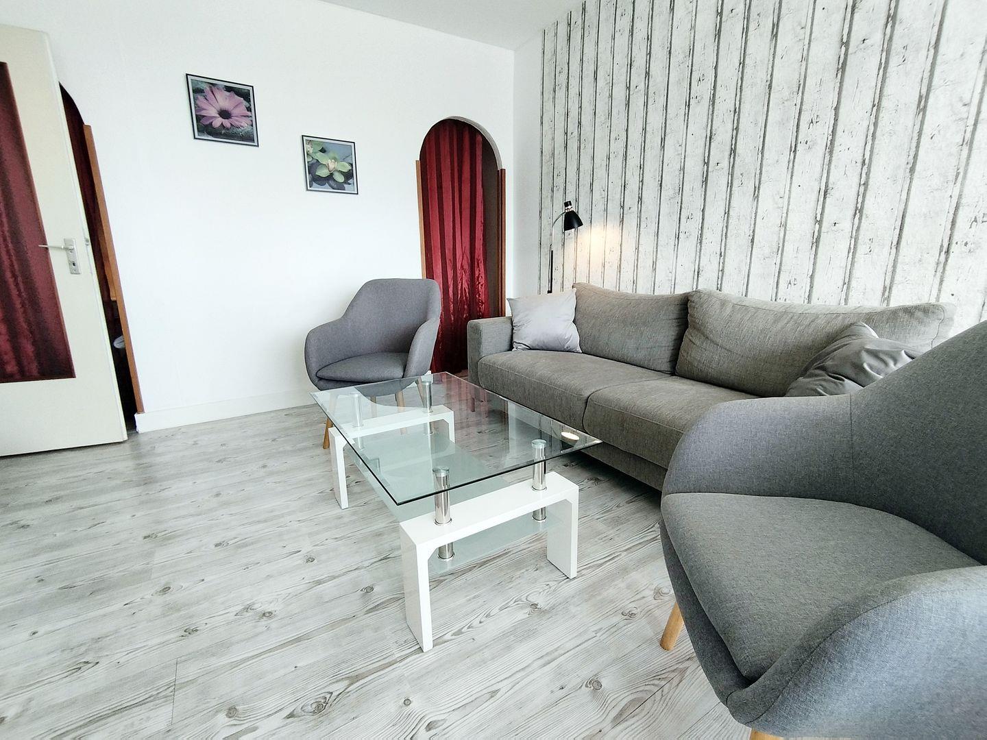 Die moderne, helle Wohnung ist für bis zu 4 Personen eingerichtet. der Wohnbereich verfügt über einen Laminat-Fußboden, eine Ledercouch, Sessel, großem TV und WLAN.