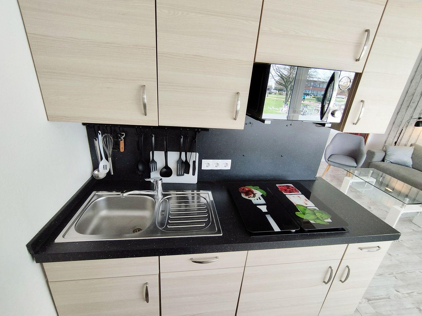 Die Küche verfügt u.a. über einen Backofen, Cerankochfeld und Mikrowelle.