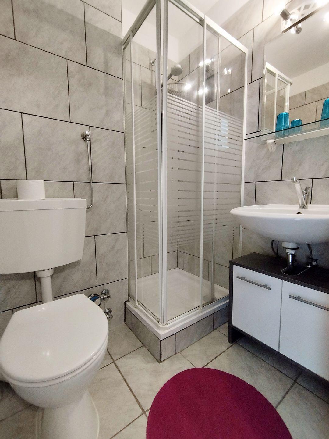 Das Badezimmer mit Dusche ist neu und modern gefliest.
