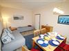 Das gemütliche Wohn-Esszimmer verfügt über eine bequeme Couchgarnitur mit 2 Sesseln sowie einem Schrankbett und einem Flachbild-TV.
