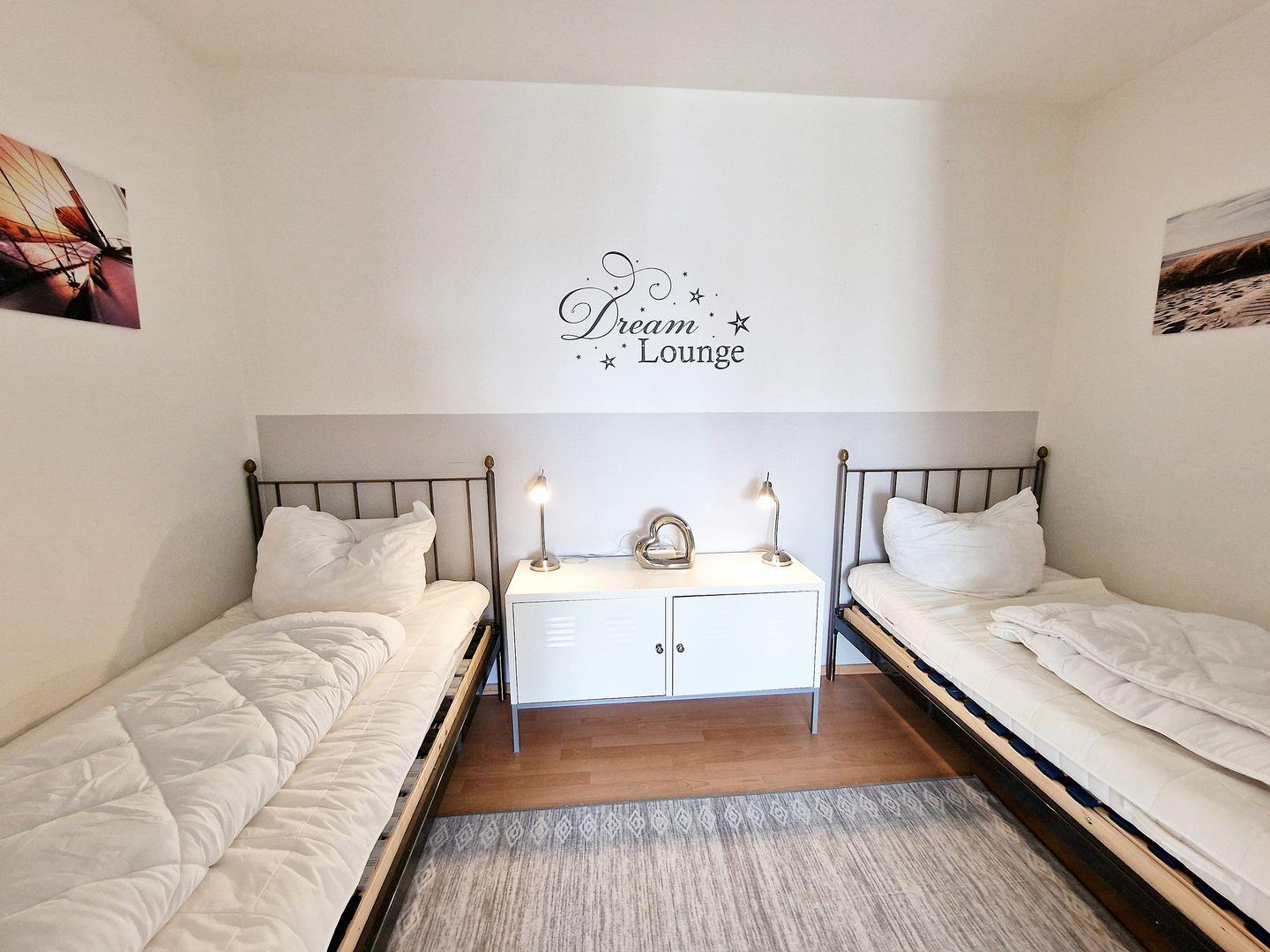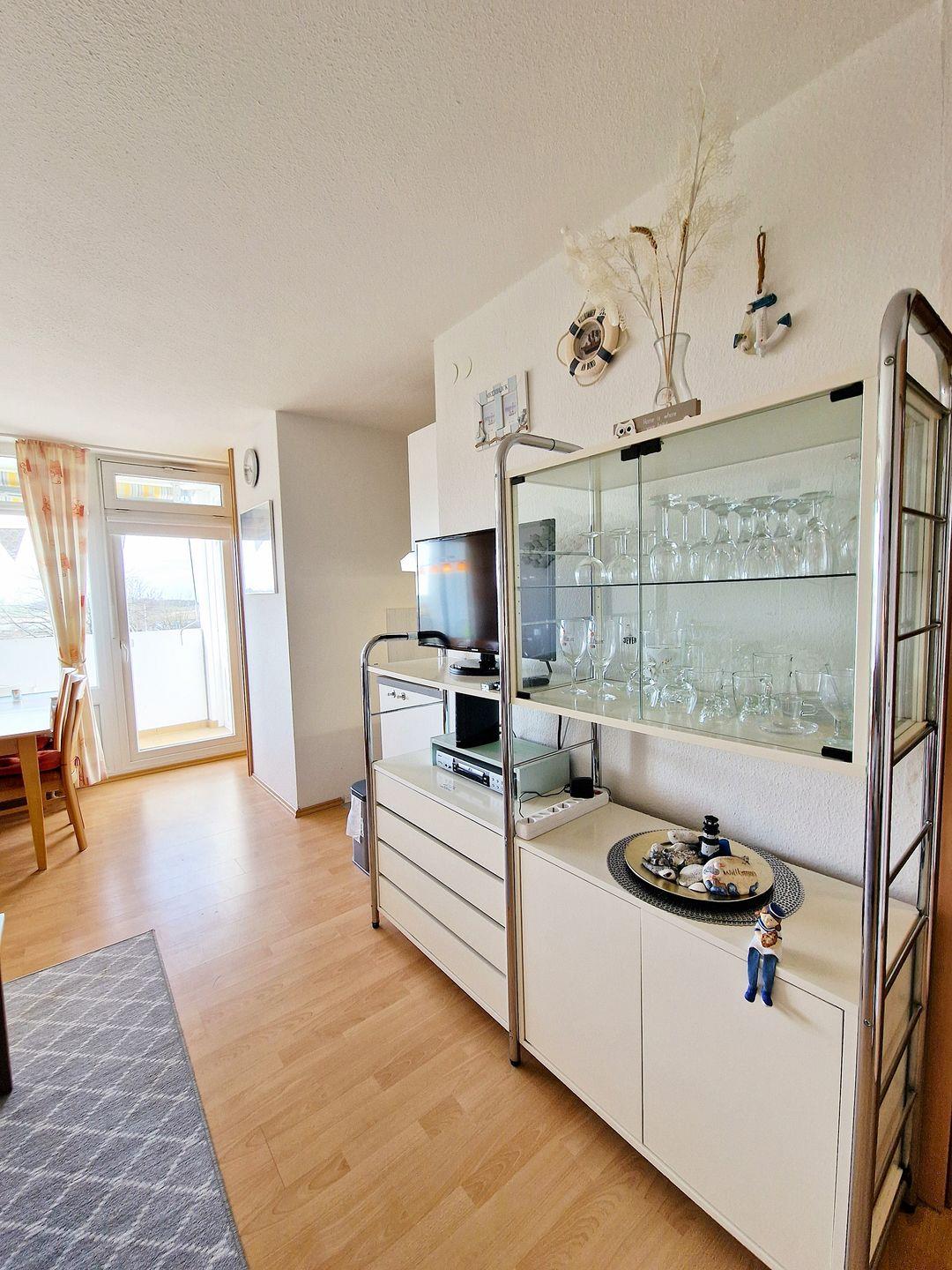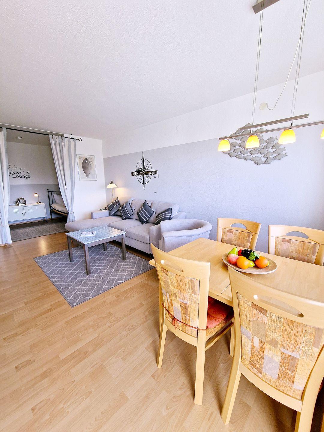 In dieser Ferienwohnung mit kombiniertem Wohn- Schlafbereich können Sie es Sich gutgehen lassen! Sie verfügt über eine gemütliche Couchgarnitur (inkl. Schlaffunktion), Flachbild-TV und einen gemütlichen Essbereich direkt am Fenster. Vom Wohnbereich abgeteilt, befindet sich ein Schlafbereich mit zwei Einzelbetten - dieser Bereich ist mit