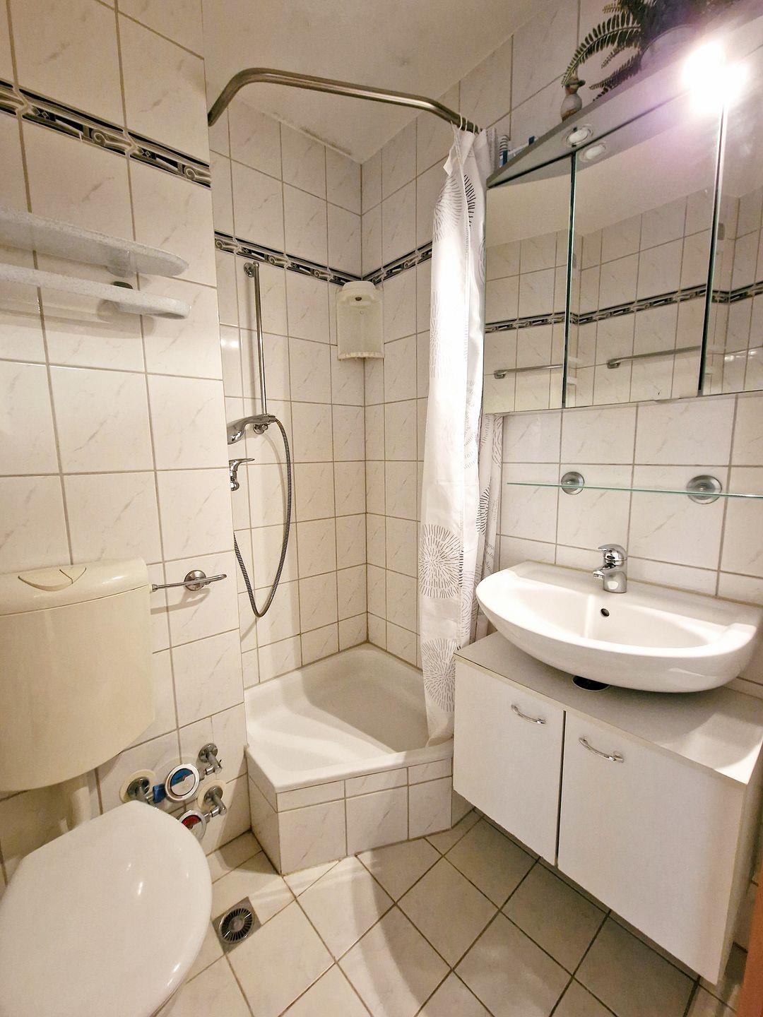 Das Badezimmer ist mit Dusche, Waschbecken, WC und einem Handtuchheizkörper ausgestattet.