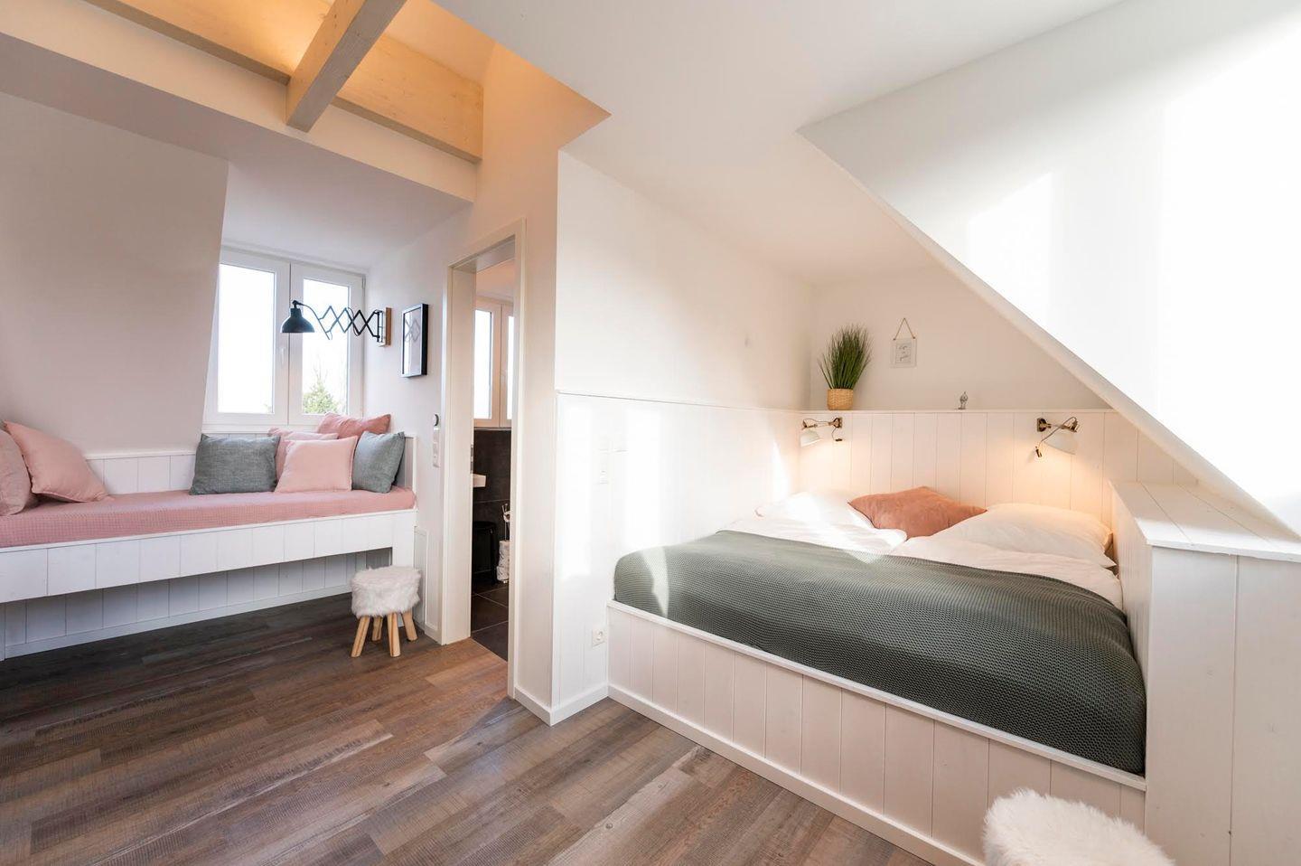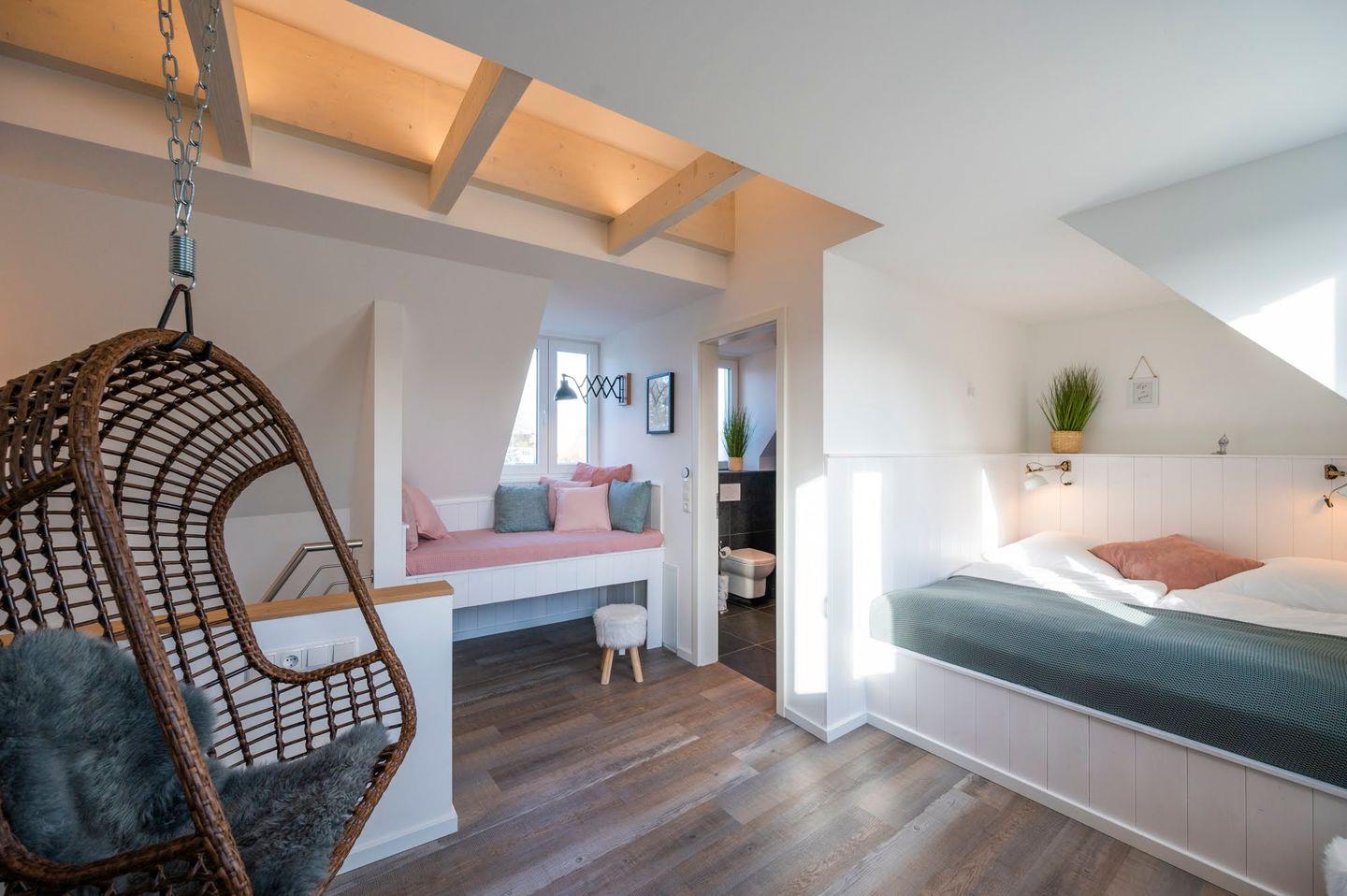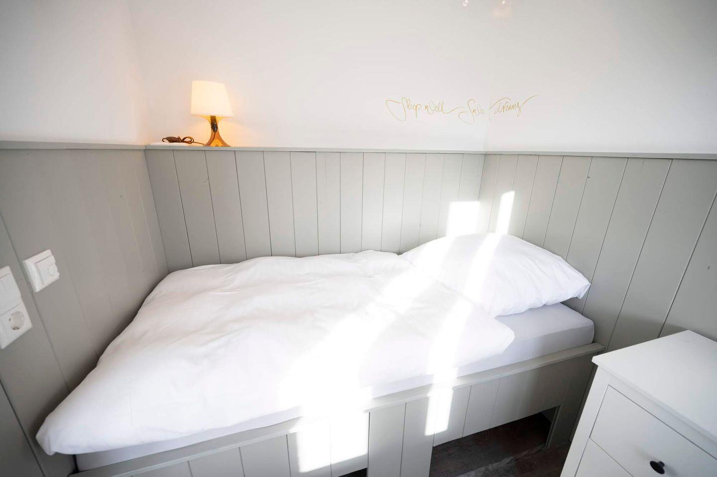 Das 1. Obergeschoss umfasst ein Schlafzimmer mit einem Doppelbett und TV, ein weiteres Schlafzimmer mit einem Kojenbett (1,90 x 0,90 m) sowie ein Badezimmer mit Dusche und WC. Weiter die Treppe hinauf gelangen Sie in das 2. Obergeschoss. Hier befindet sich das dritte Schlafzimmer mit einem Kojenbett (1,80 x 2,00 m), eine Hängeschaukel am Dachbalken, eine gemütliche Lese-/Lounge Ecke, von der aus man schön aus dem Fenster gucken kann, und ein Badezimmer mit Dusche und WC.