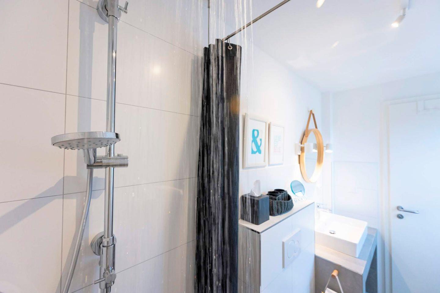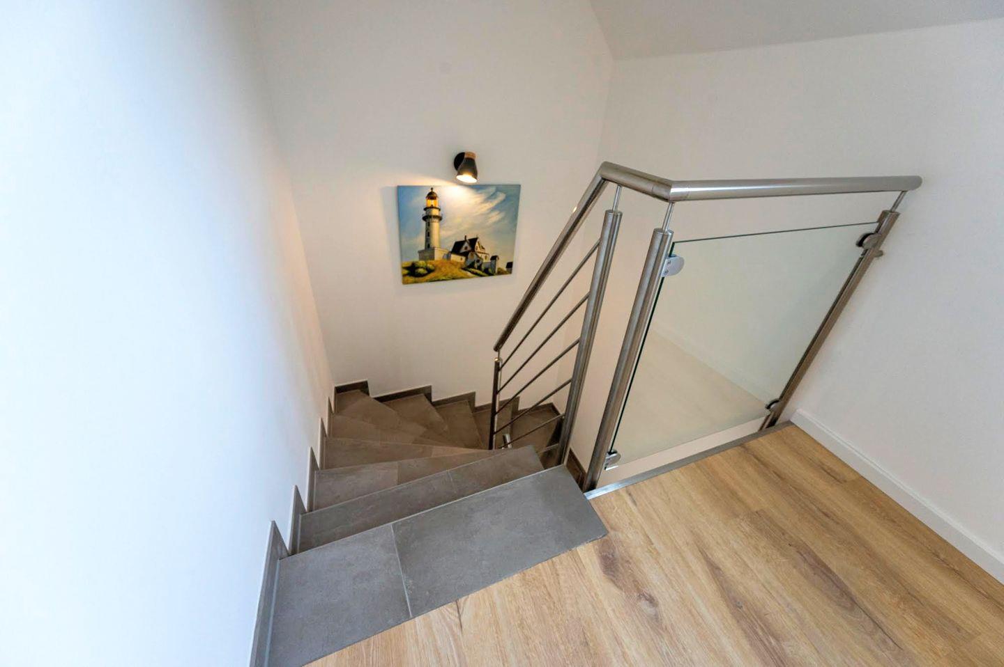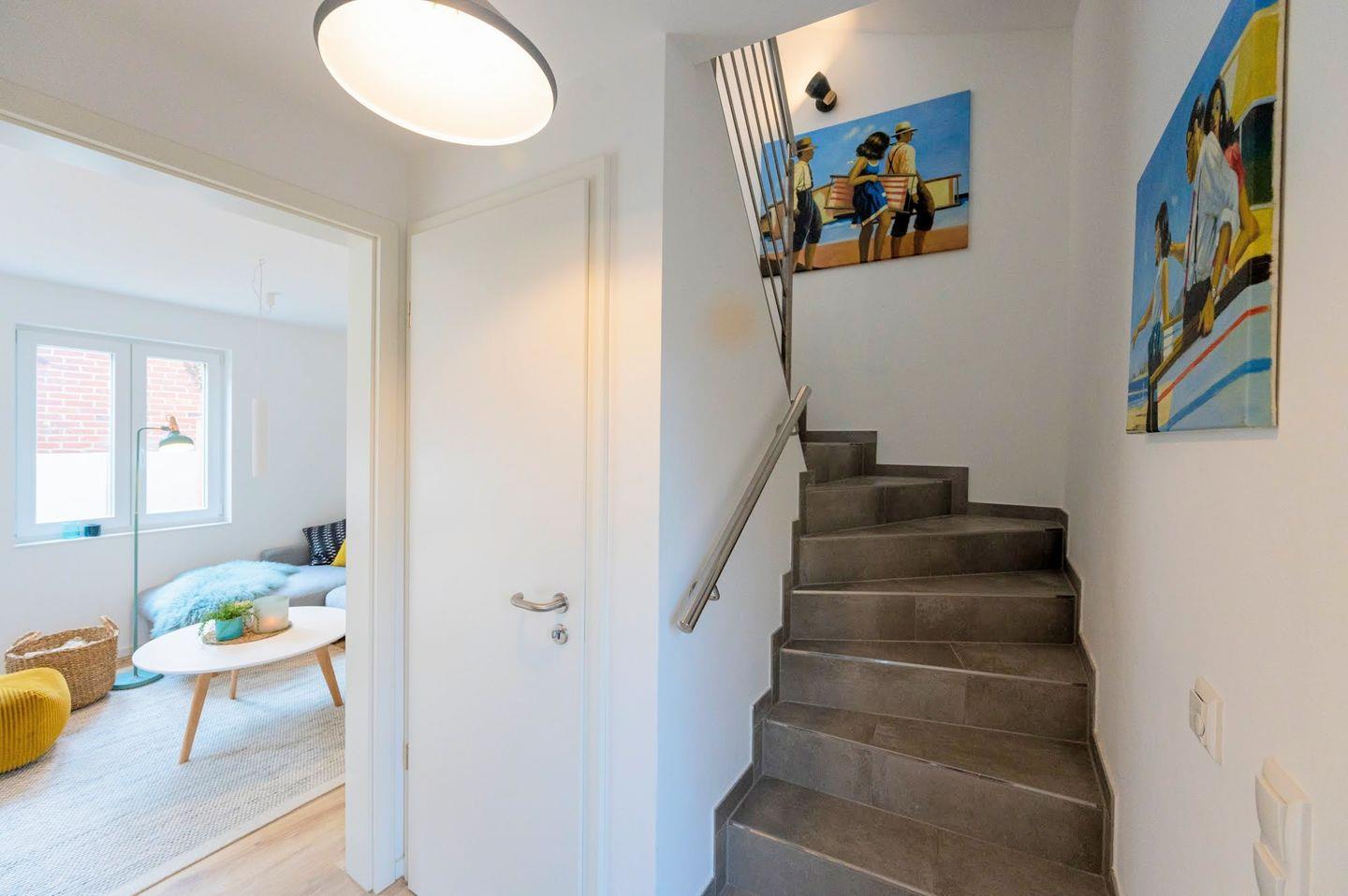 Im Erdgeschoss befinden sich ein Gäste-WC, die offene Wohnküche, eine Essecke, das Wohnzimmer mit Smart-TV sowie der Zugang zur 25 m² großen Terrasse. Die vollständig geschützte und sehr ruhige Hinterhof-Terrasse wird durch eine schöne Sauna ergänzt.
