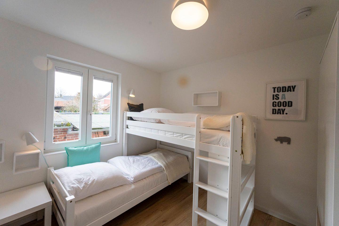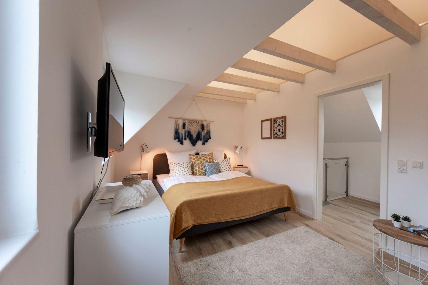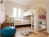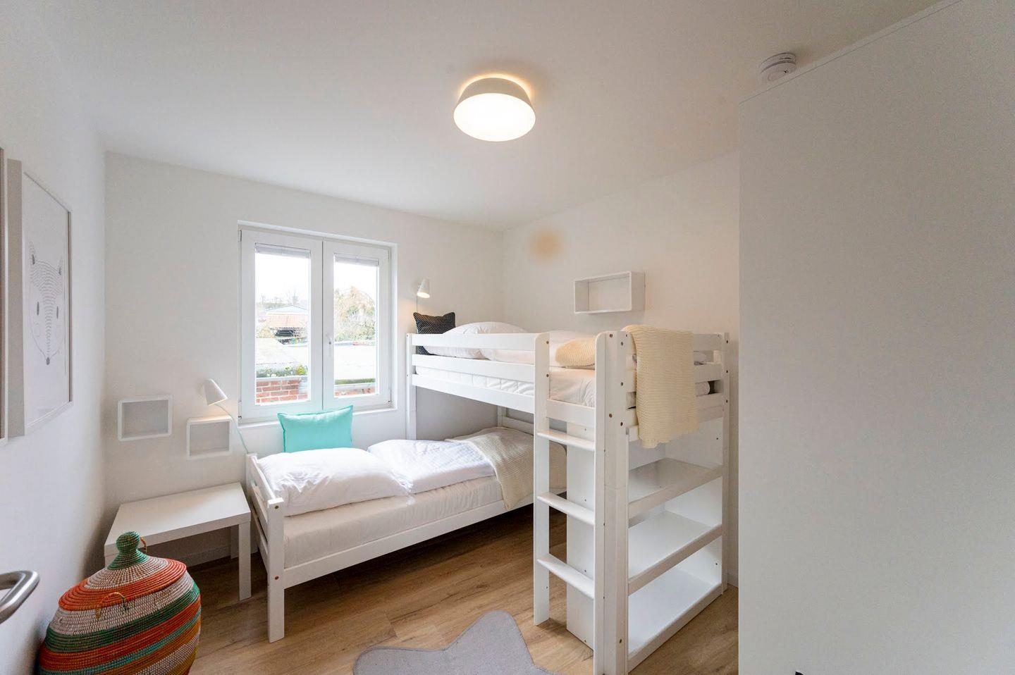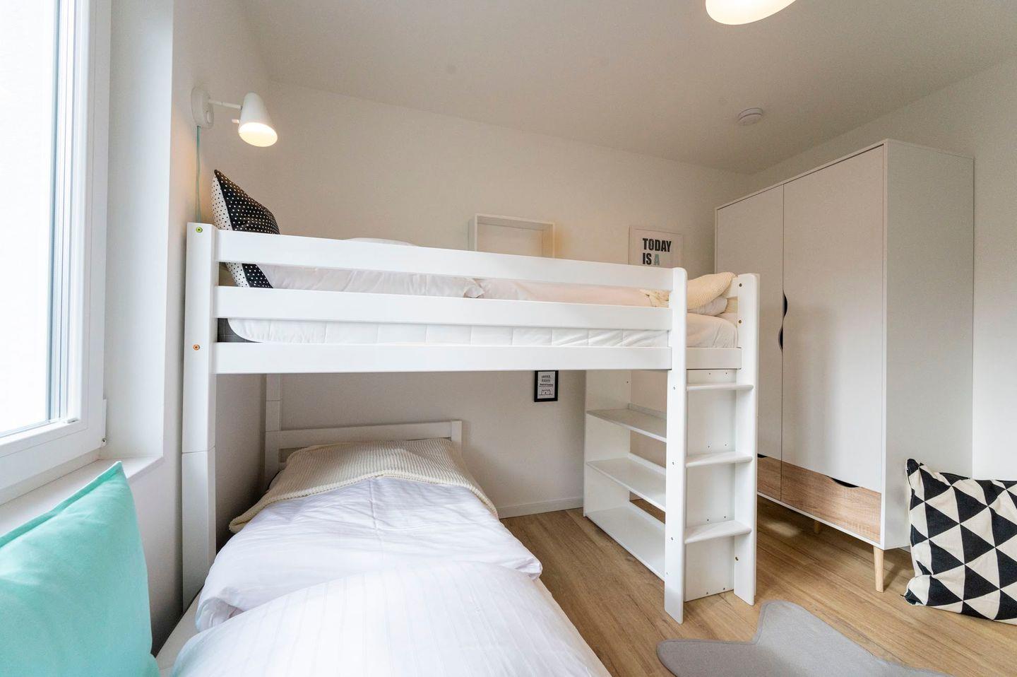 Über die Treppe gelangen Sie direkt in das Kinderzimmer mit einem seitlich versetzten Hochbett und viel Platz zum Spielen. Für die ganz Kleinen bieten wir zusätzlich ein Reisebett und Treppengitter an. Außerdem gibt es ein Schlafzimmer mit Doppelbett. Diese Etage wird durch ein geräumiges Duschbad komplettiert.