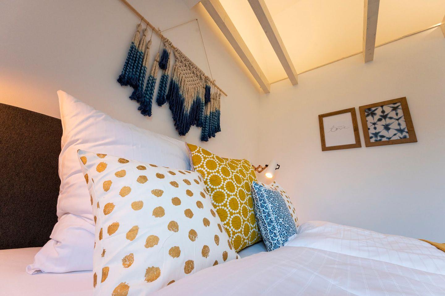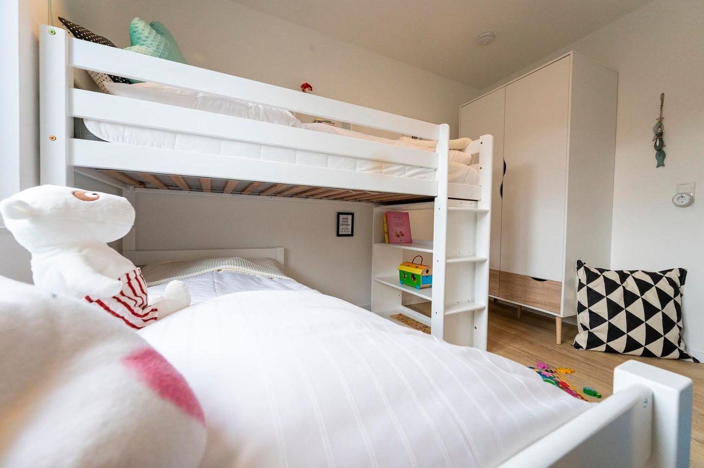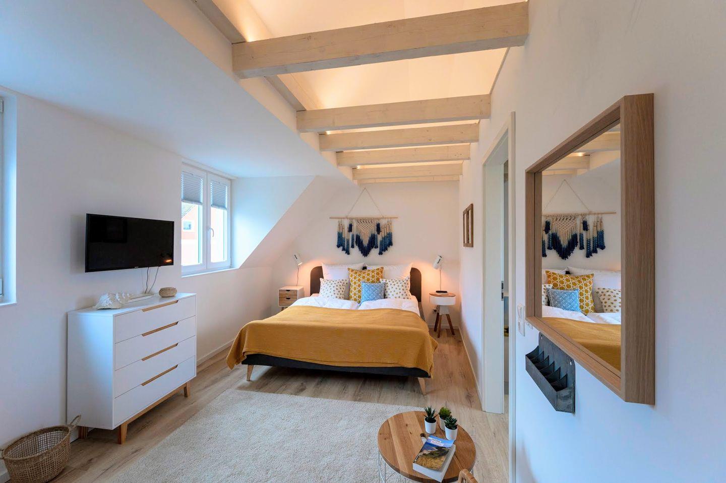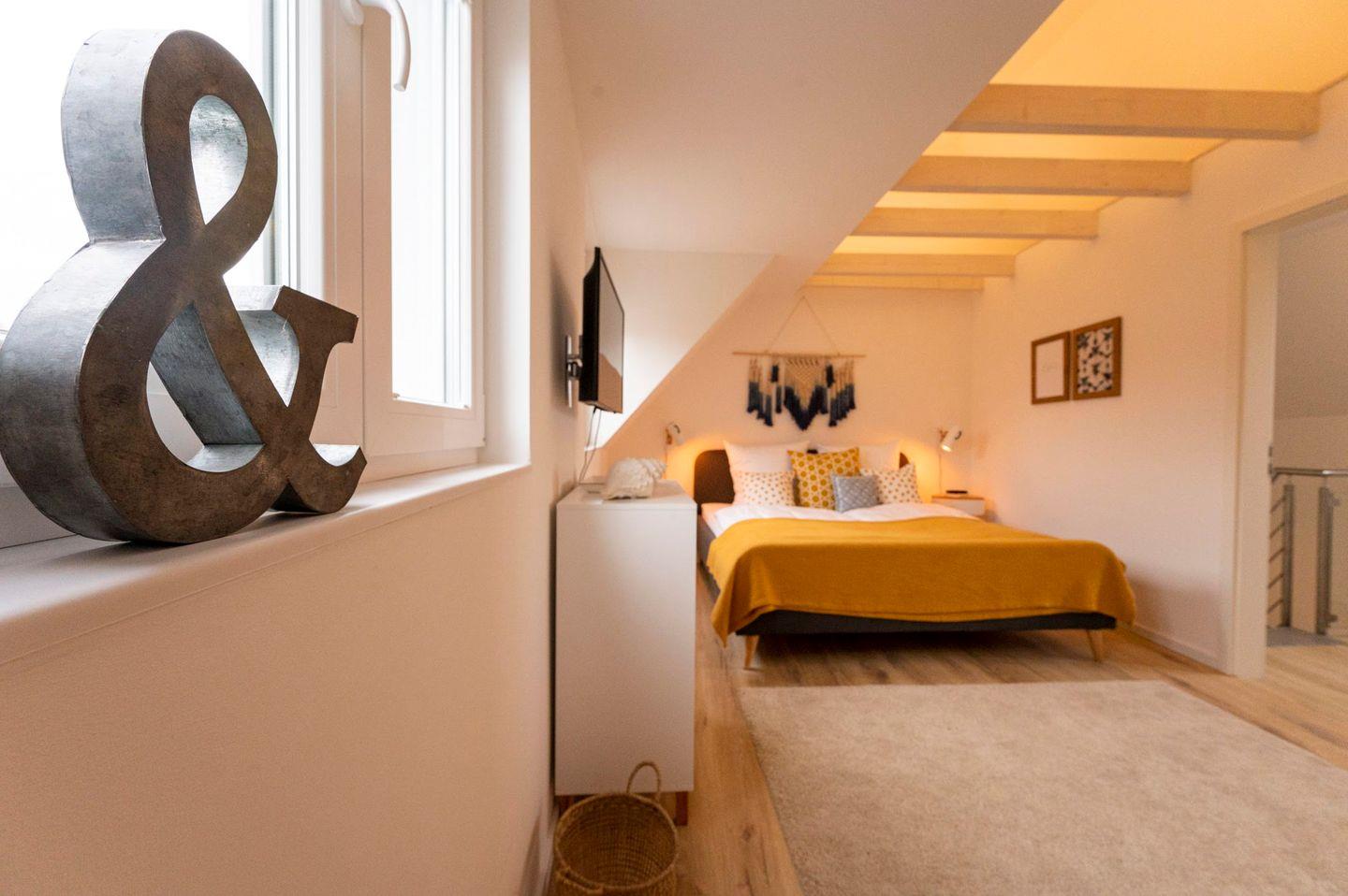 Über die Treppe gelangen Sie direkt in das Kinderzimmer mit einem seitlich versetzten Hochbett und viel Platz zum Spielen. Für die ganz Kleinen bieten wir zusätzlich ein Reisebett und Treppengitter an. Außerdem gibt es ein Schlafzimmer mit Doppelbett. Diese Etage wird durch ein geräumiges Duschbad komplettiert.