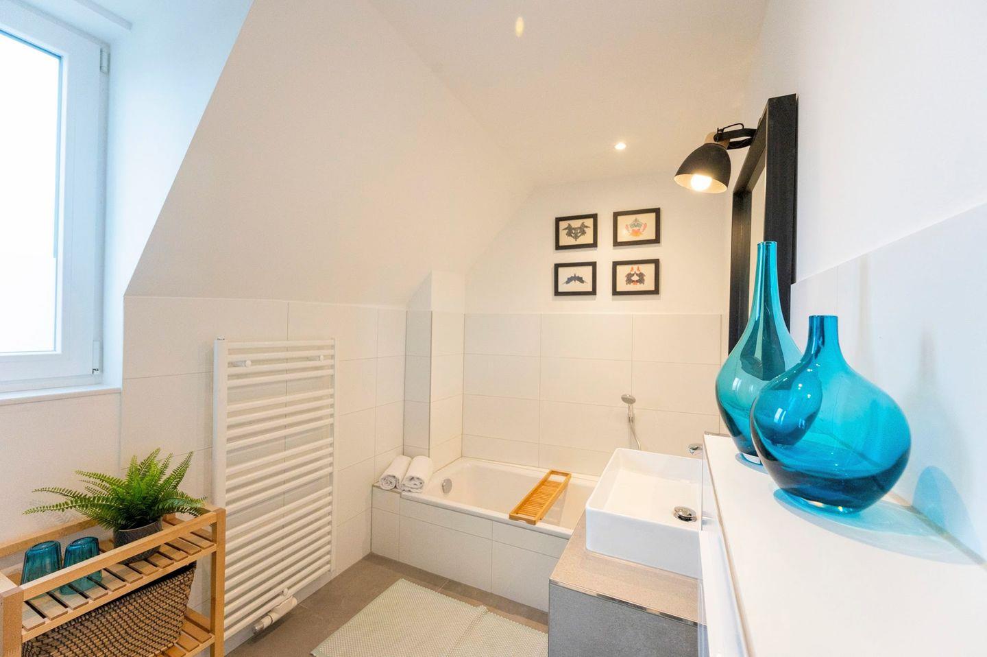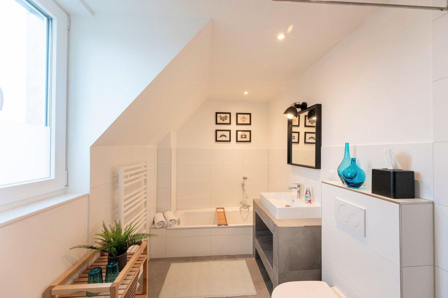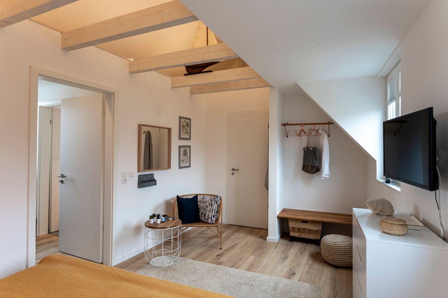 Im 2. Obergeschoss befindet sich das dritte Schlafzimmer mit Doppelbett und einer Leseecke. Das Badezimmer auf dieser Etage ist mit einer Badewanne, einem Fenster, einer Toilette und einem Waschbecken ausgestattet.