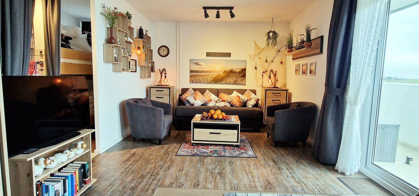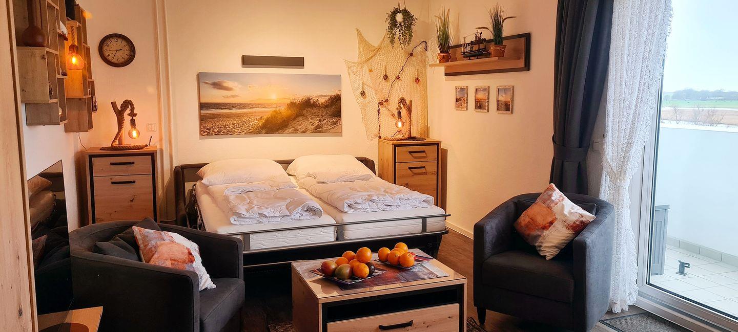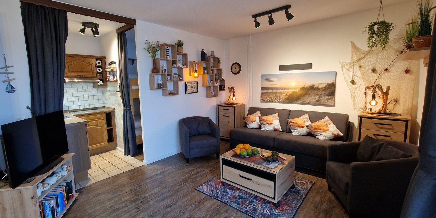 Im Wohnbereich erwartet Sie eine gemütliche Couchgarnitur (190 cm) und zwei bequeme Einzelsessel, ein großer Sony-LCD-Smart-TV und ein DAB+-Radio. Die Couch lässt sich zu einem stabilen Doppelbett (Gel-Matratzen) mit einer Liegefläche von 180 x 200 cm umbauen (in der Beschreibung als Klappbett angegeben). Somit stehen für max. 4 Pers. zwei zusätzliche Schlafmöglichkeiten zu ihrer freien Verfügung.