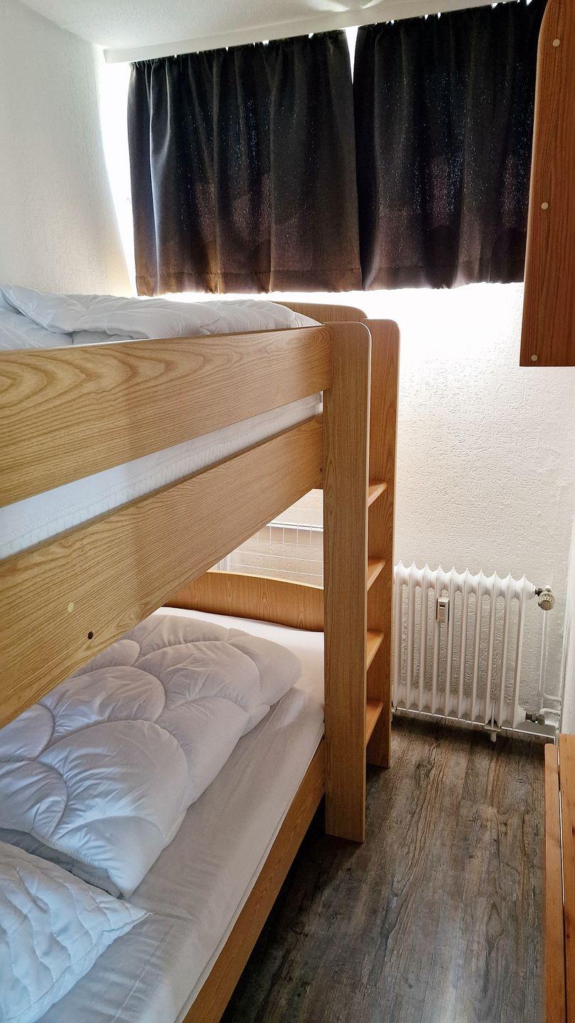 Das Kinderzimmer (separat mit blickdichtem Vorhang vom Wohnbereich getrennt) verfügt über ein großes Etagenbett (2 x 90*200cm) mit höherer Kopffreiheit.