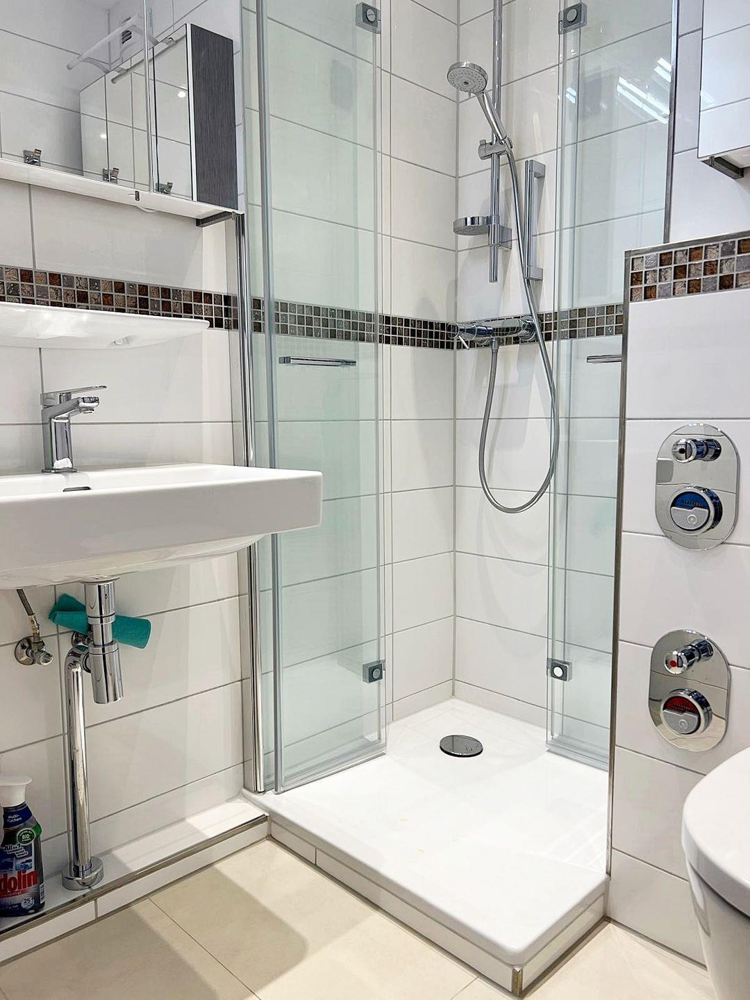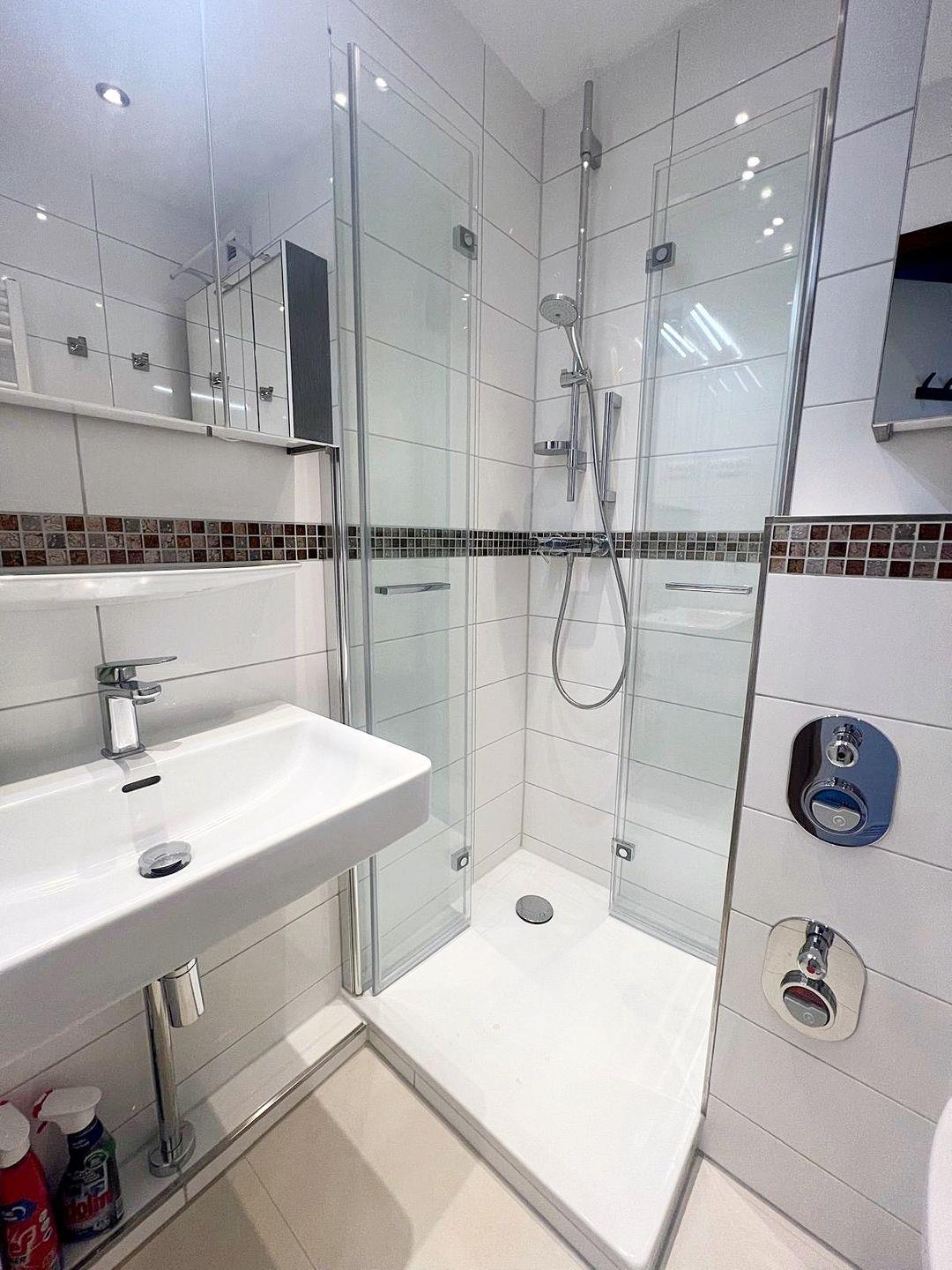 Das Badezimmer verfügt über eine Dusche mit flachem Eingang (5cm), einem WC, zwei großen Spiegelschränken für das perfekte Haarstyling und einem Waschbecken. Sehr gut ausgeleuchtet wird das Bad durch zahlreiche Downlights.