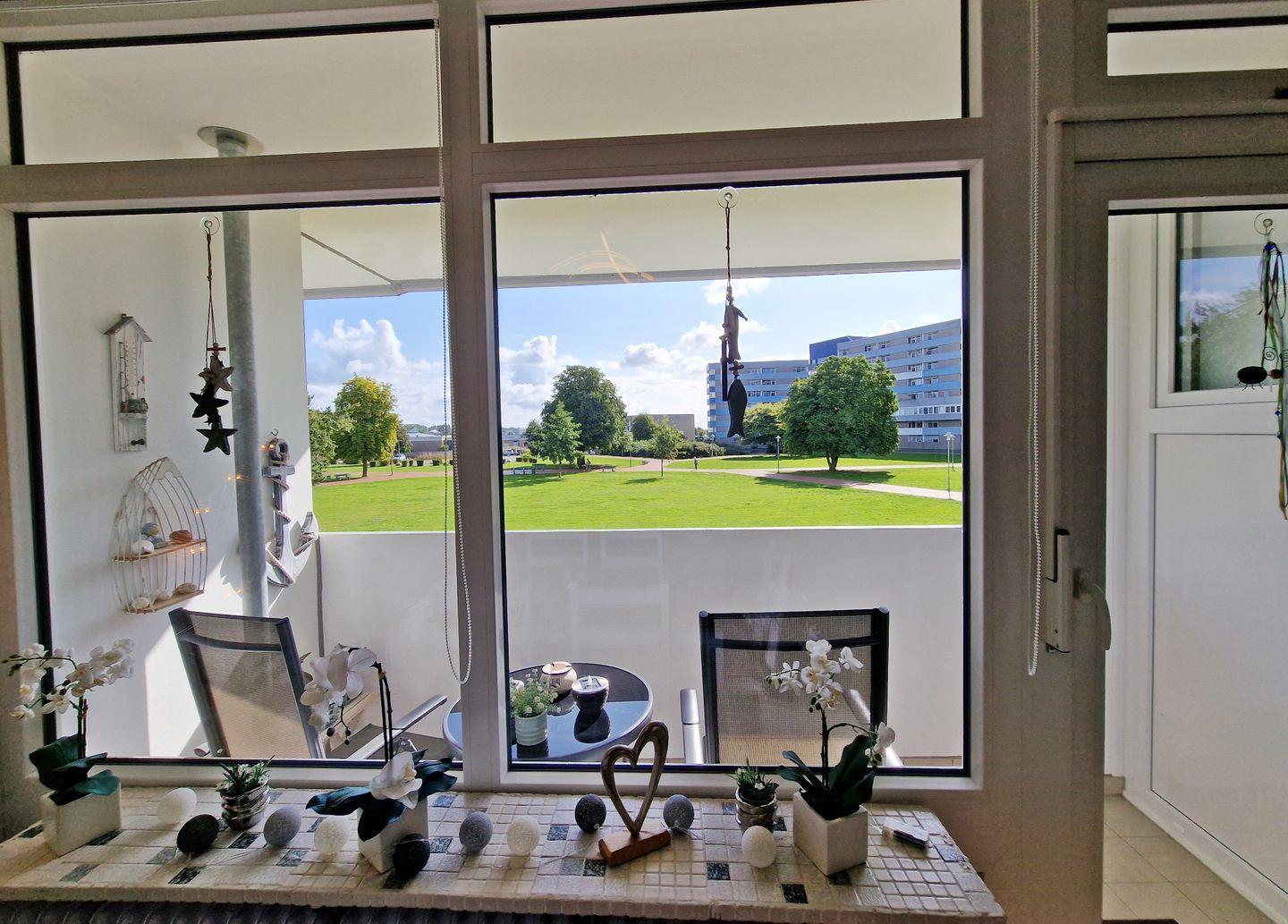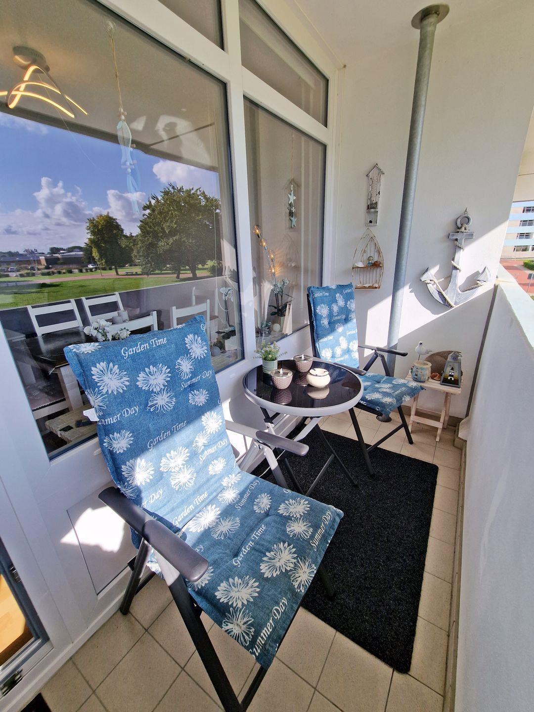 Balkon mit gemütlichen Sitzgelegenheiten und Blick ins Grüne in Richtung Binnensee.