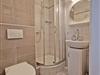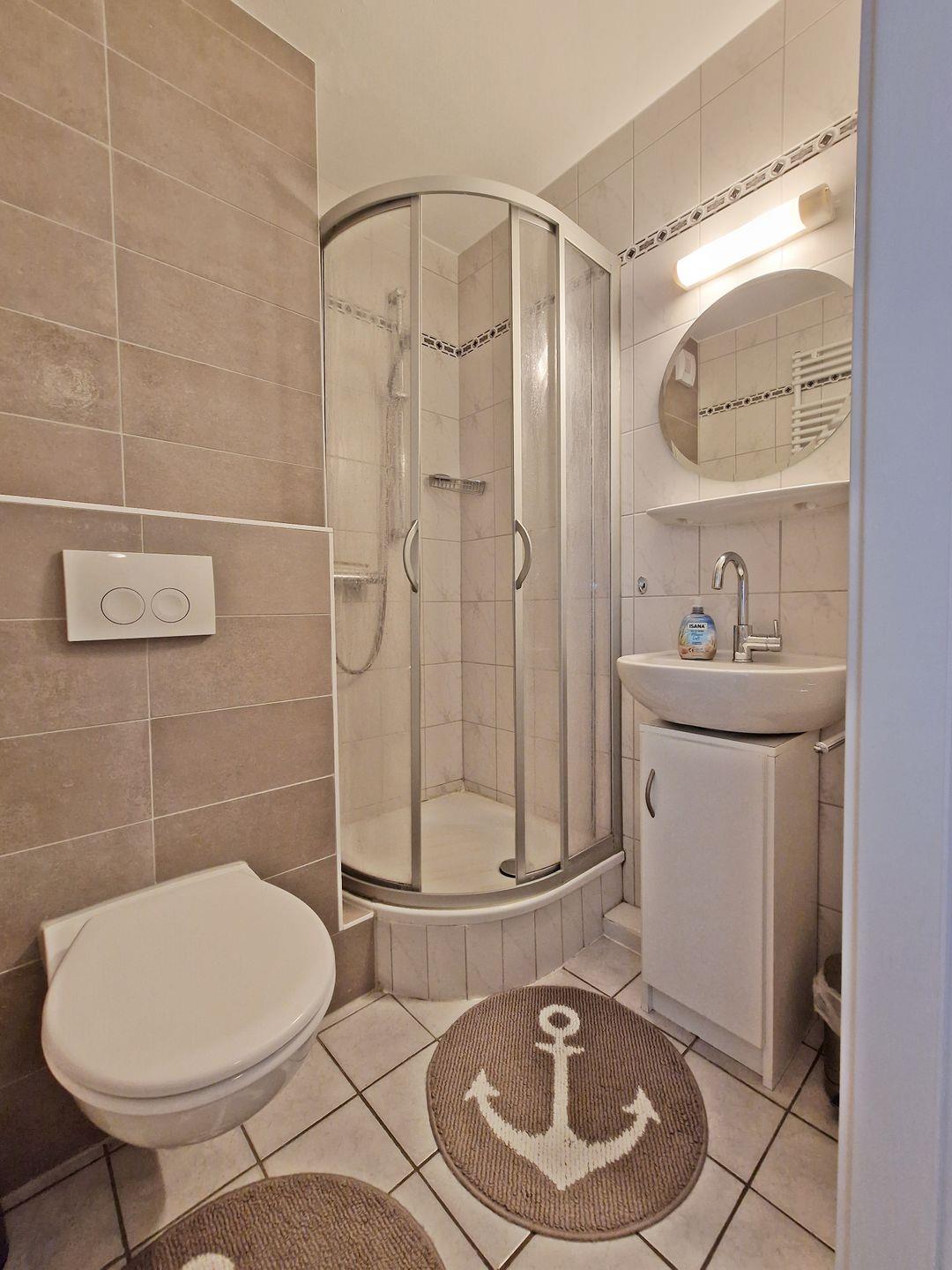 Das Badezimmer verfügt über eine Duschkabine, ein Hänge-WC, Waschbecken und Spiegel sowie über einen modern Handtuchheizkörper.