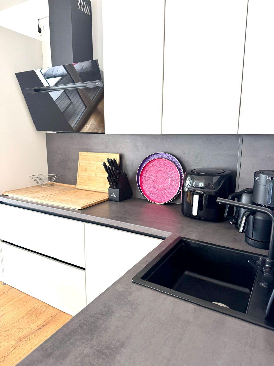 Die offen zum Wohnzimmer gestaltete Küche erfüllt sämtliche Wünsche an Funktionalität: Sie ist mit Induktionsherd, Elektroofen, großem Kühlschrank, zusätzlichem Gefrierschrank, Spülmaschine, Kaffeemaschine und Nespresso Citiz & Milk, Toaster, Wasserkocher, Mixer, Eierkocher, Airfryer sowie umfangreichen Küchenutensilien, Geschirr und Besteck ausgestattet. Damit sind ideale Bedingungen für eigene Kochabende gegeben.