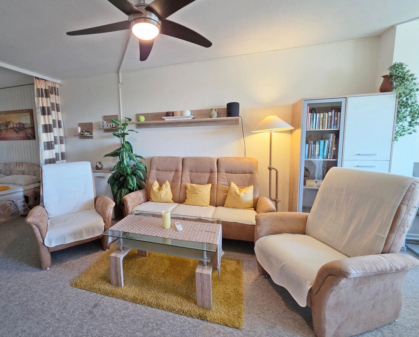 Das Wohnzimmer ist mit einer komfortablen Sofaecke, Sesseln sowie einem Esstisch und einer Kommode ausgestattet.