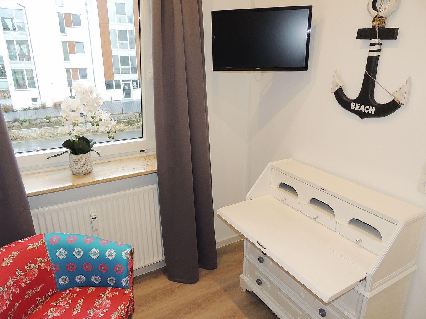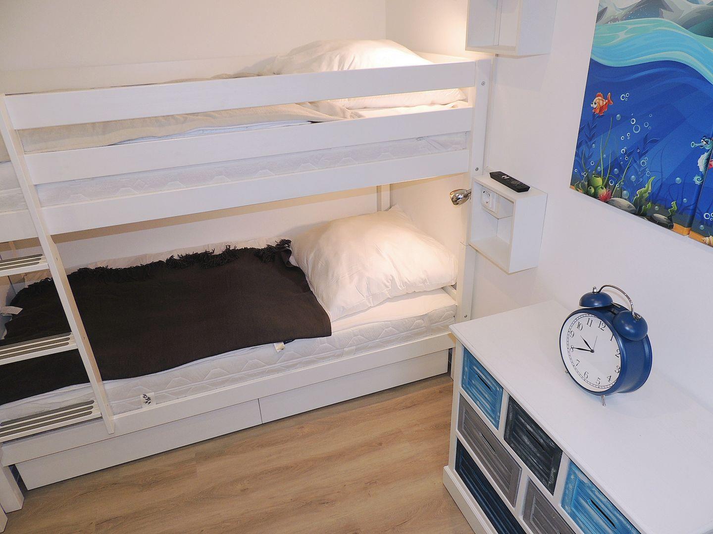 Im separaten Kinderzimmer finden 2 Personen im Etagenbett Platz (90*190 cm). Hier gibt es für die Unterhaltung einen eigenen Fernseher, einen Schreibtisch und einen Kindersessel. Auch dieses Zimmer verfügt über ein Fenster zur Ostseeseite. Auch hier verfügen die Steckdosen über einen USB-Anschluss.