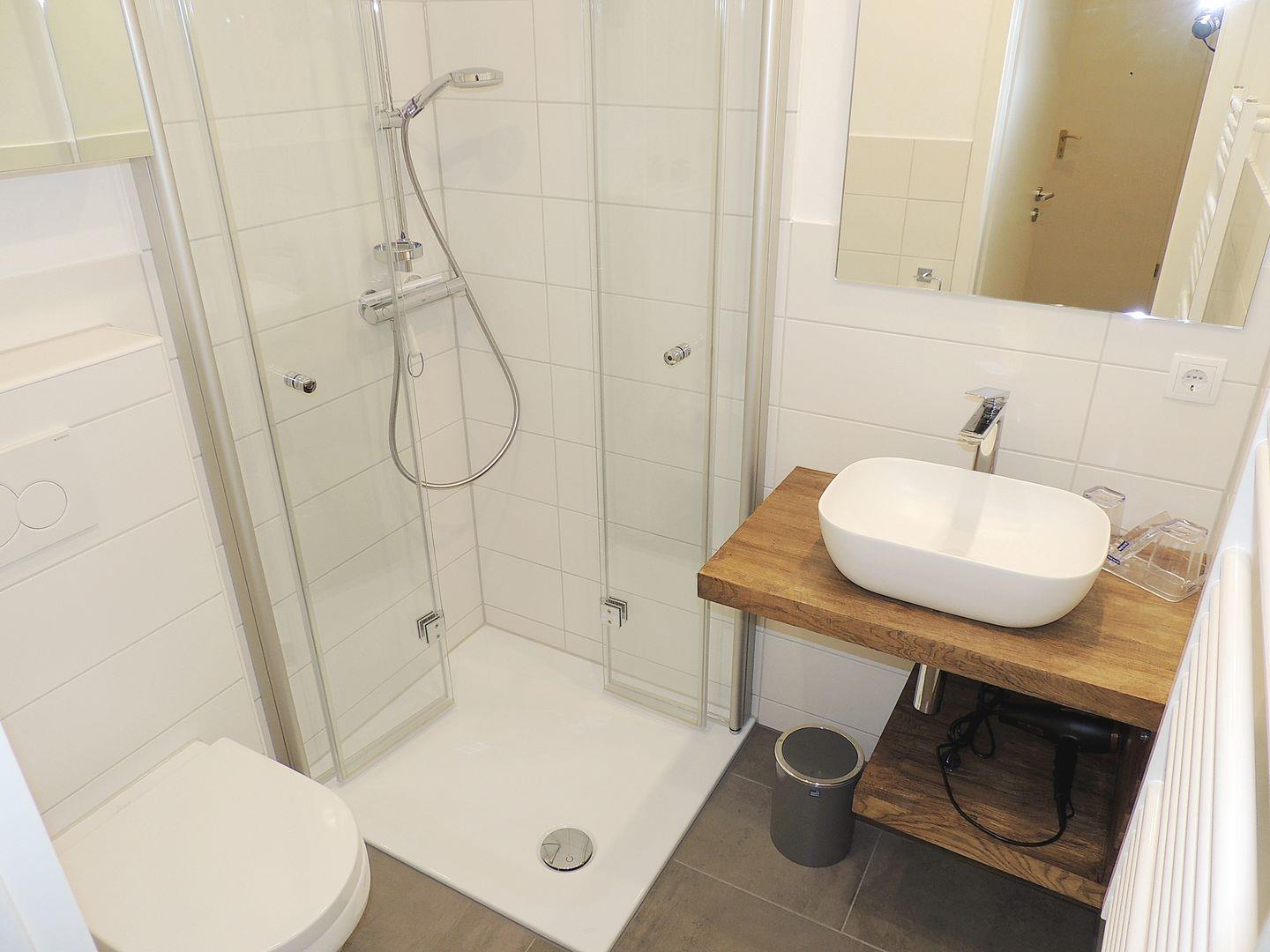 Das Bad ist mit einer bodenhohen Dusche ausgestattet.