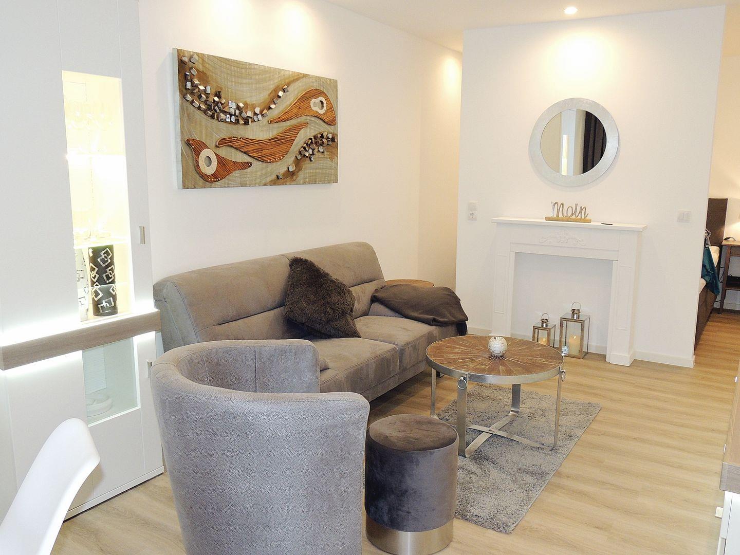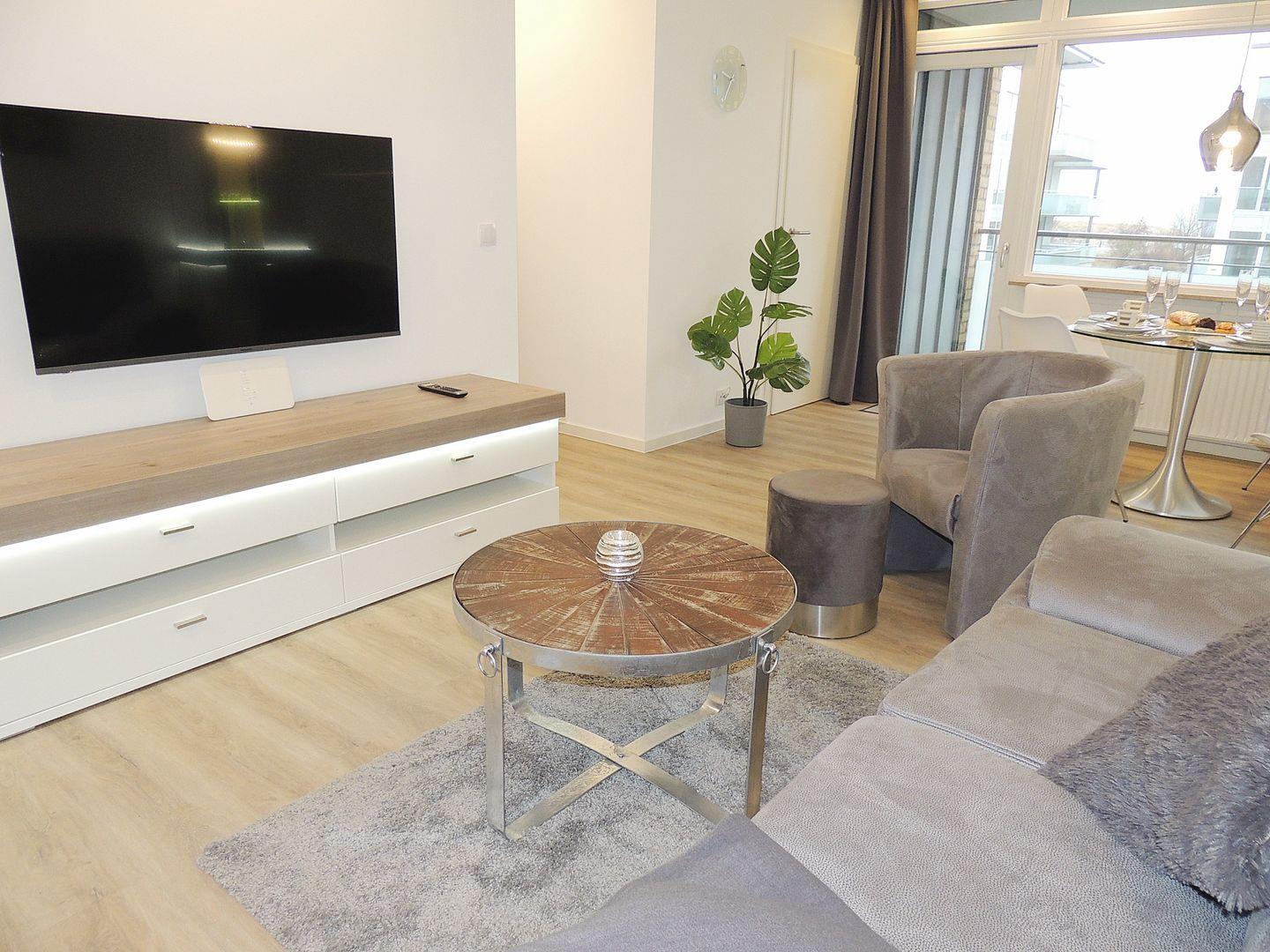 Die Einrichtung ist aufeinander abgestimmt und vermittelt ein sehr gemütliches und schönes Ambiente. Der Wohnraum verfügt über eine 2er-Couch und einen separaten Sessel. Für die Gemütlichkeit im Raum sorgen u.a. ein angedeuteter Kamin und in die Decke eingebaute indirekte Beleuchtung. Auch die Schränke verfügen über Lichtleisten im Glasbereich, welche für tolle Lichtverhältnisse im Raum sorgen. Der 122cm große Fernseher und kostenfreies WLAN sorgen für Unterhaltung, wie auch die Spielesammlung im TV-Unterschrank. Die Essecke befindet sich direkt am großen Fenster, welches zur Ostsee ausgerichtet ist und bietet für bis zu 4 Personen Platz. Für die musikalische Unterhaltung bietet Ihnen unsere Multimediastation folgende Funktionen: Internetradio, Blutoothlautsprecher, Radio DAB+ / UKW.