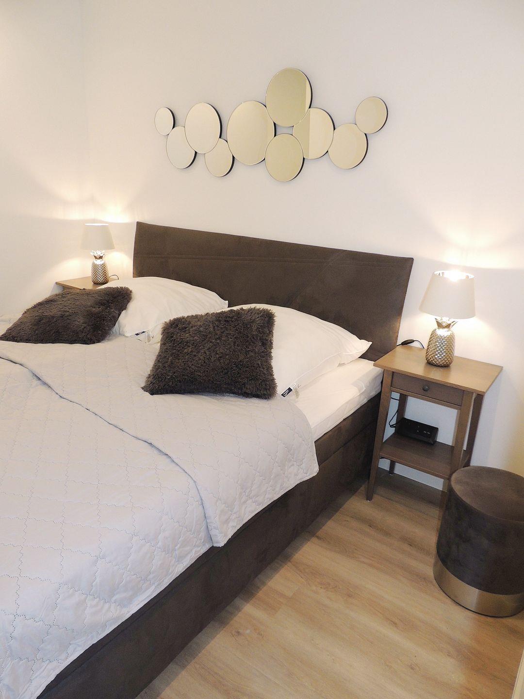 Im Wohnbereich befindet sich, durch eine 3/4-Wand abgetrennt, der Schlafbereich mit Doppelbett mit zwei einzelnen Matratzen (Größe 90*200 cm). Die Steckdosen verfügen über einen USB-Anschluss zum Laden entsprechender Geräte.