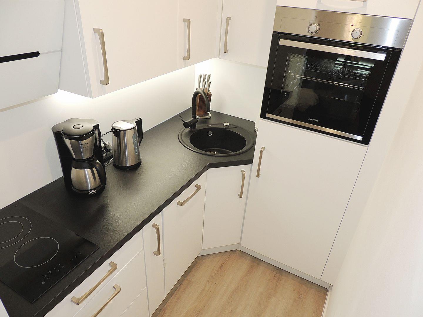 Die Küche ist ebenfalls komplett neu und verfügt über die üblichen Utensilien für bis zu 4 Personen, ein 2er-Cerankochfeld, Backofen, Kaffeemaschine, Wasserkocher, Eierkocher und eine 45er Spülmaschine. Der Kühlschrank verfügt über ein 3*-Kühlfach.