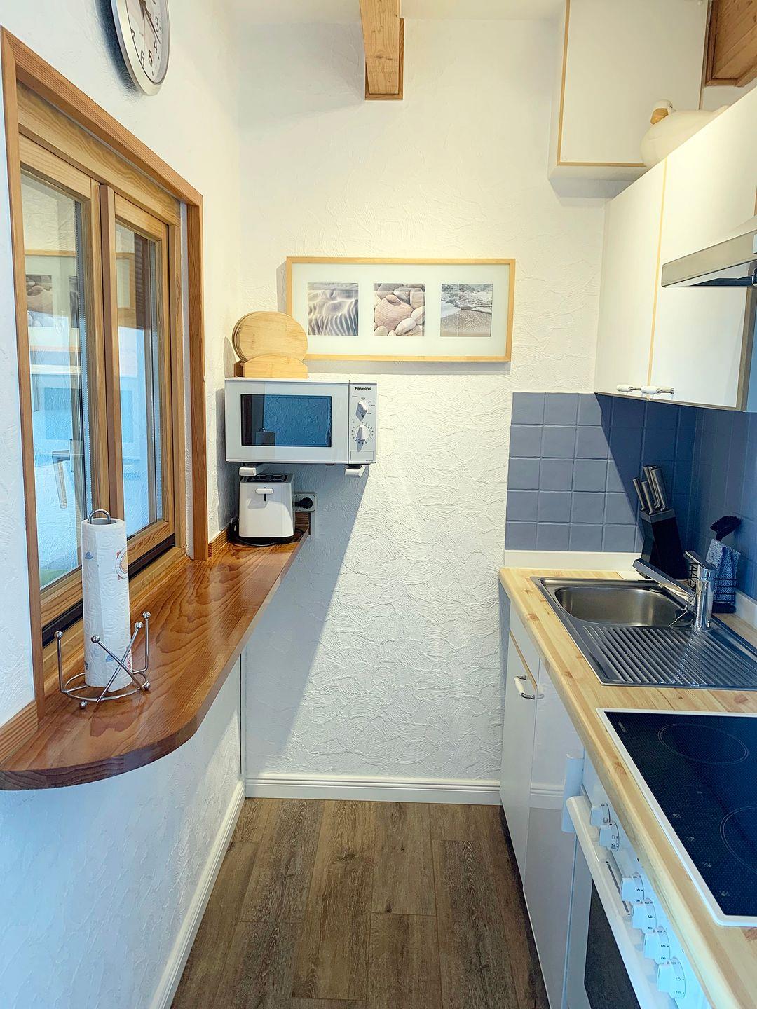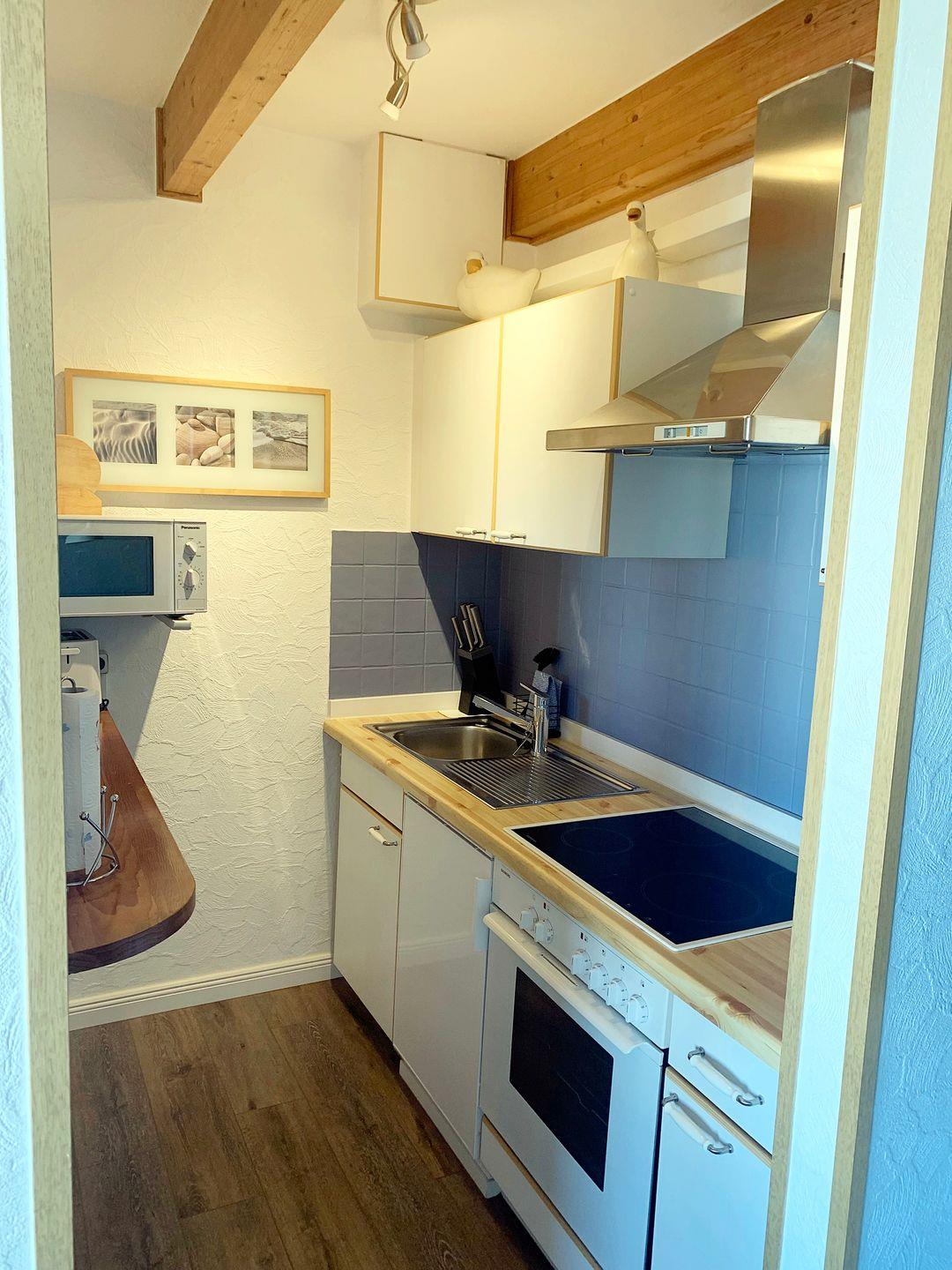 Küchenzeile mit 4er-Ceranfeld und Backofen und Mikrowelle. Tiefkühlfach ist im Kühlschrank vorhanden.