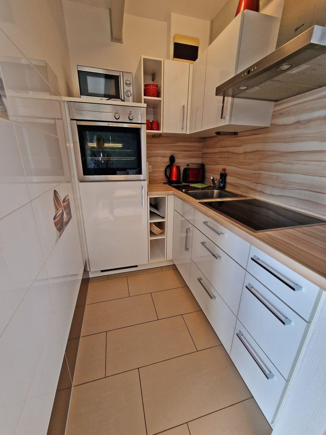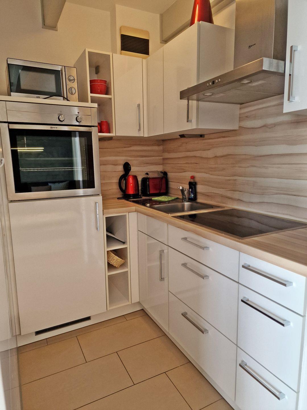Die gut ausgestattete Kochnische lässt keine Wünsche offen – hier finden Sie alles, was Sie für die Zubereitung Ihrer Mahlzeiten benötigen, darunter Herd, Backofen, Mikrowelle und Kühlschrank. Zudem stehen Geschirr, Besteck und Küchenutensilien bereit.