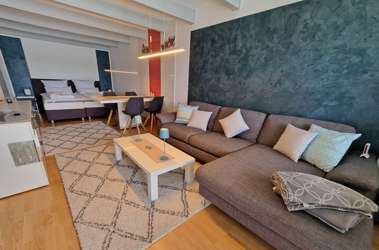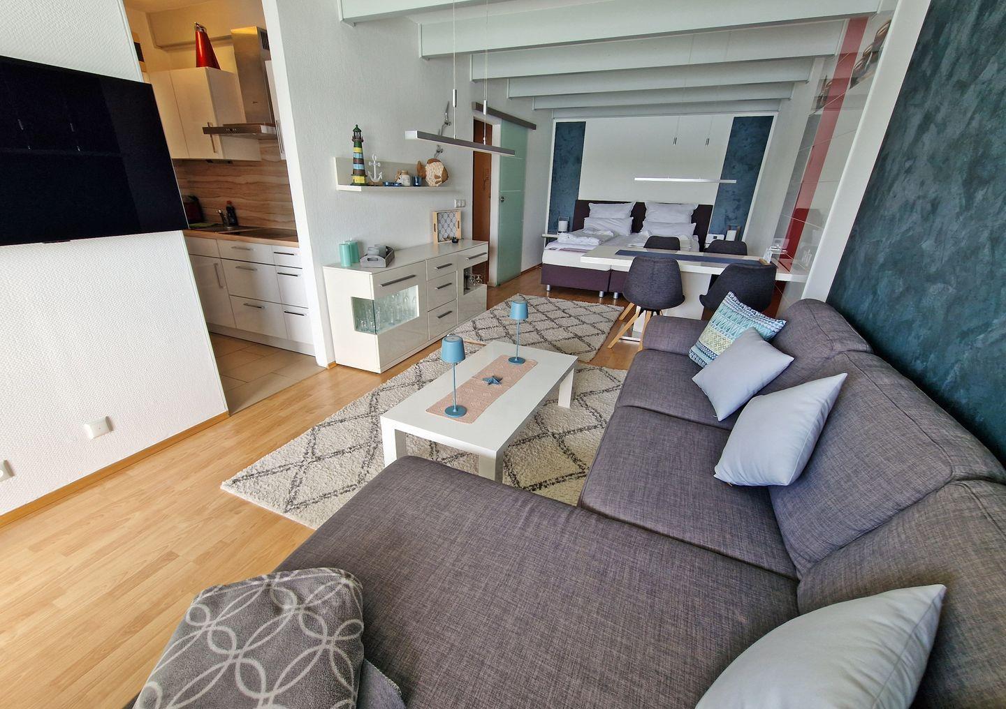 Mit einer Gesamtgröße von 47 m² bietet diese komfortable Ferienwohnung Platz für bis zu zwei Personen und lässt sich dank des Balkons in Südlage ideal für entspannte Abende im Freien nutzen. Die Unterkunft verfügt über einen offenen Schlafbereich mit einem gemütlichen Doppelbett, ein helles Badezimmer mit Dusche sowie ein einladendes Wohnzimmer, das mit einem Sofa, einem Esstisch und einem modernen TV ausgestattet ist.