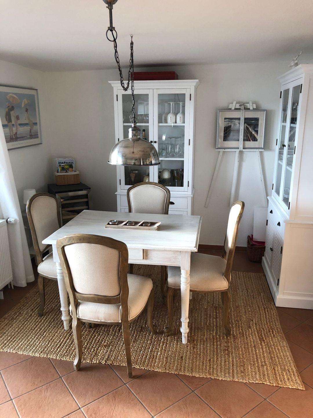 Hier werden Sie im Wohnbereich vom großen Esstisch empfangen. Die anschließende, große Einbauküche bietet viel Platz und Ausstattung zum gemeinsamen Kochen. Backofen, 4-Feld-Ceranherd, Microwelle, Geschirrspülmaschine und gängiges Zubehör unterstützen Sie bei der Zubereitung und danach.