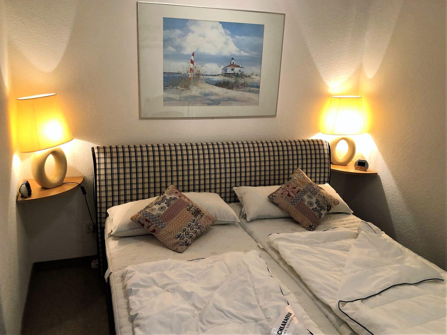 Diese exklusive Wohnung verfügt über zwei sep. Schlafzimmer mit je einem Doppelbett, sowie ein Vollbad en Suite und einem weiteren Duschbad mit WC. Die geräumige Eßdiele mit integrierter Küchenzeile lädt zu gemütlichen Mahlzeiten ein. Vom geschmackvoll eingerichteten Wohnzimmer aus, haben Sie einen traumhaften Blick auf den Binnensee und Zugang zur herrlichen Südterrasse.