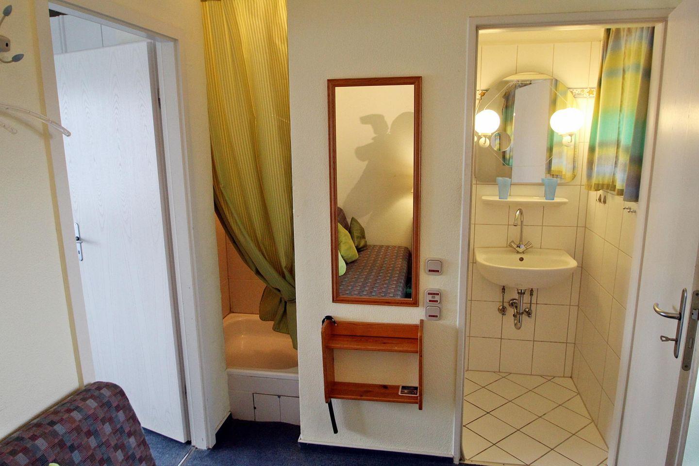 Im Eingangsbereich befindet sich ein Polsterbett für ein Kind, eine Kommode und die Möglichkeit Jacken aufzuhängen. Von hier geht auch das separate WC mit Waschbecken und beleuchtetem Spiegel ab, sowie die Dusche, die durch einen Duschvorhang vom Eingangsbereich / Kinderschlafzimmer abgegrenzt wird.