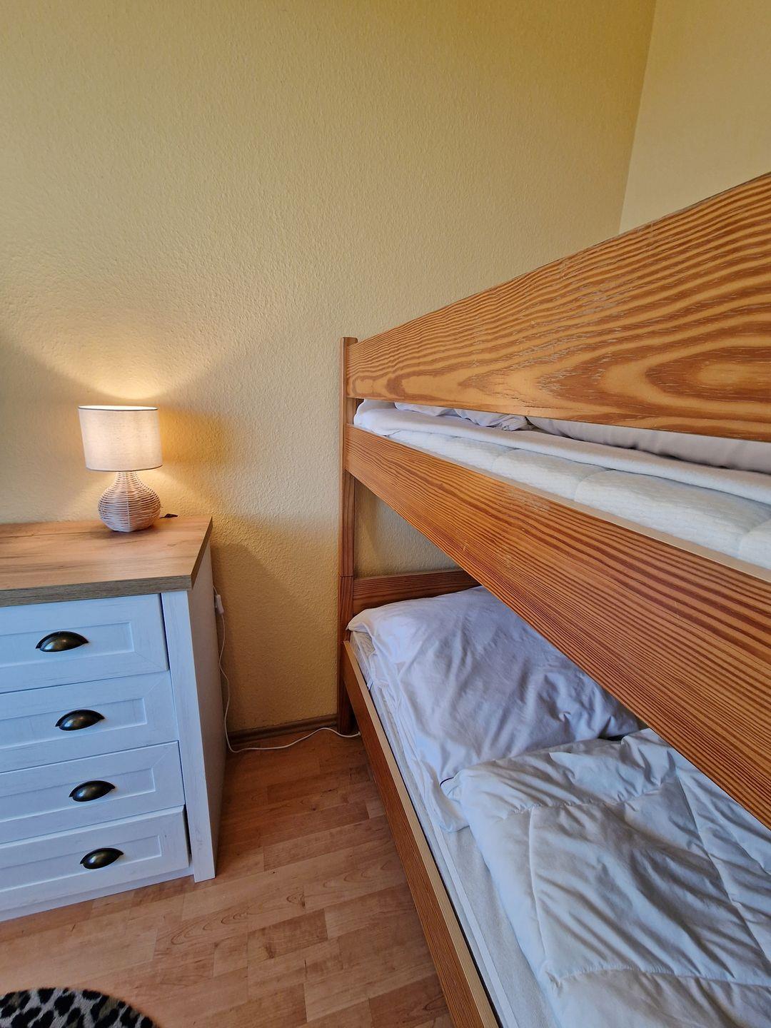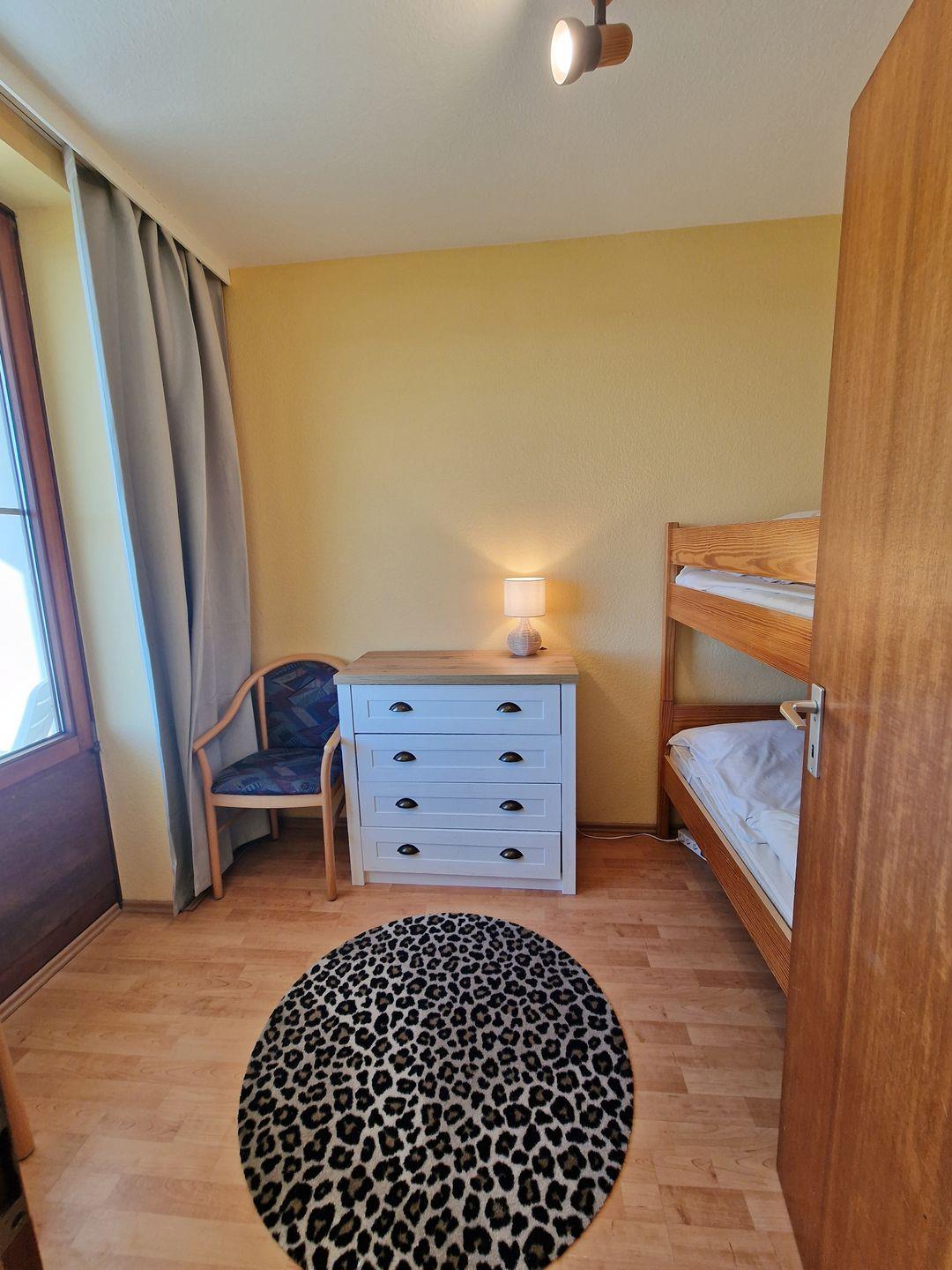 Im Kinderzimmer mit Fenster zum Balkon (mit Insektenschutz) bieten ein Etagenbett (Matratzengröße 80*190 cm) und Verdunklungsgardinen ruhige Urlaubsnächte für unsere jungen Ostseefans. Ein Kleiderschrank hält Stauraum für alles Mitgebrachte bereit, ein weiterer Schrank mit Spielen und Kinderbüchern sorgt für Unterhaltung.