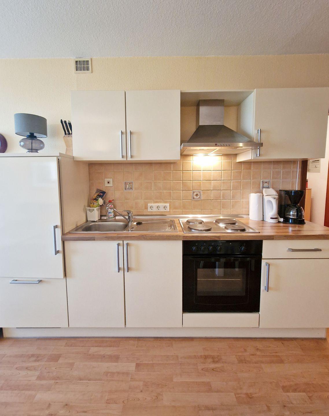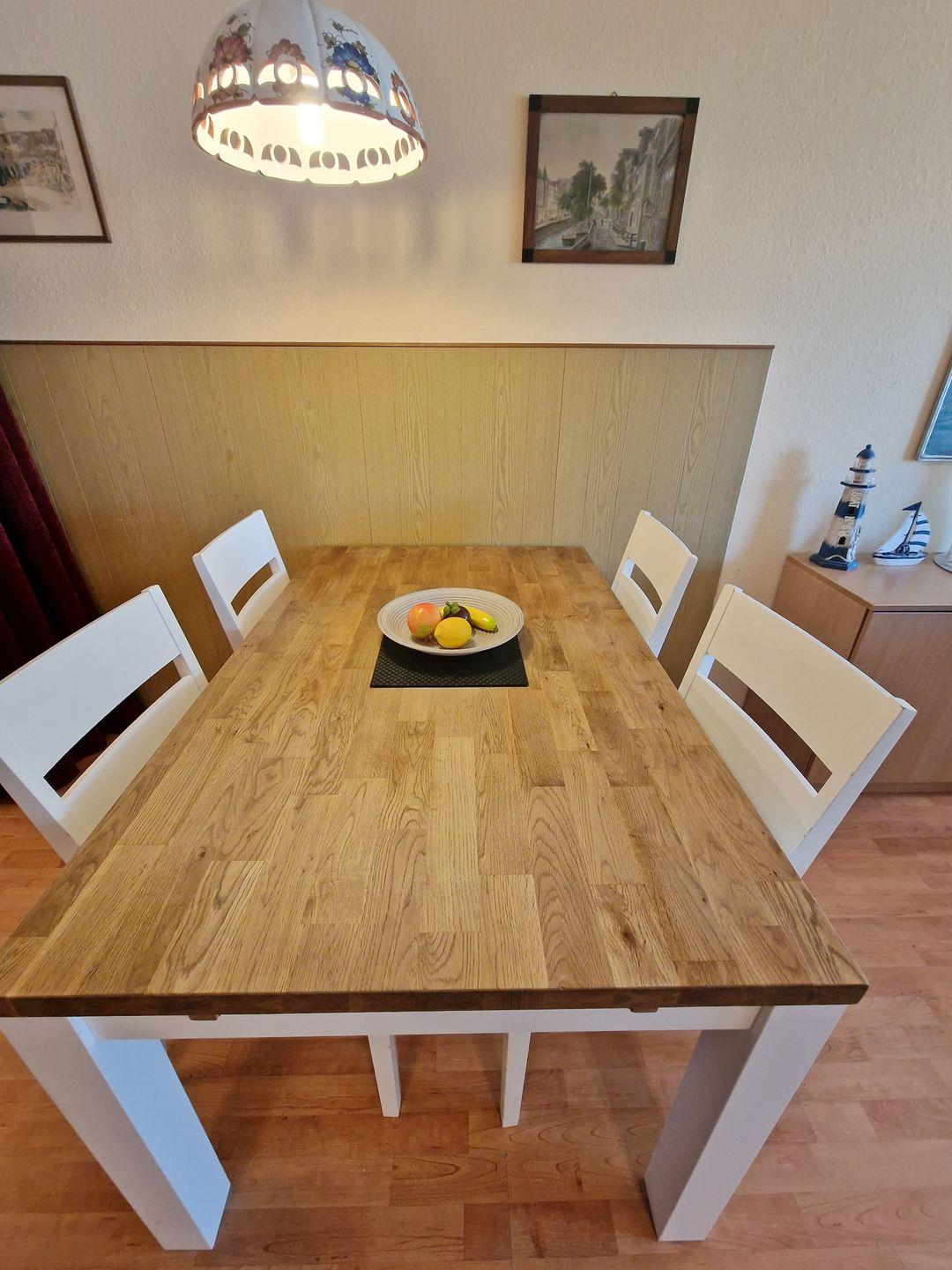 Weiter geht’s im kombinierten Wohn-/Esszimmer mit Küchenzeile. Die Einbauküche bietet Ihnen einen Backofen, großen Kühlschrank mit Gefrierfach sowie einen 4-Platten-Herd und alle übliche Ausstattung zum Kochen und Verzehren. Zubereitetes können Sie gemeinsam am gegenüberliegenden Esstisch genießen.