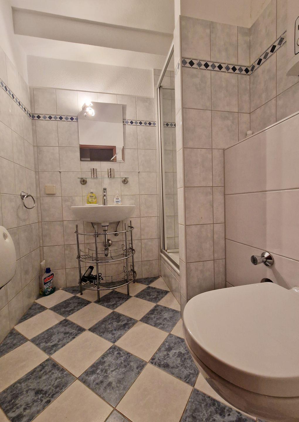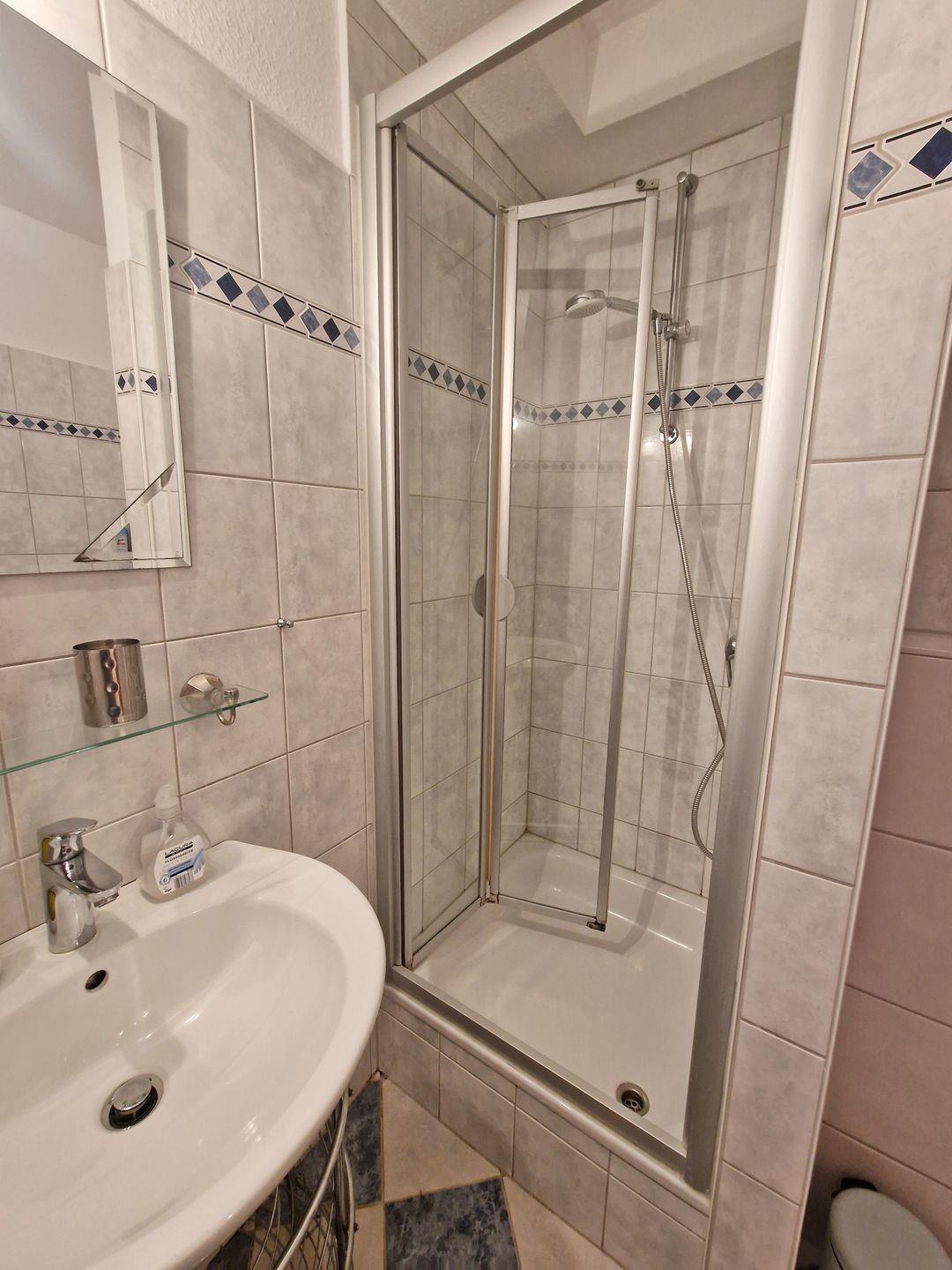 Von hier erreichen Sie das innenliegende Duschbad mit Waschbecken, beleuchtetem Spiegelschrank, Steckdosen, elektrischer Lüftung, Elektroheizlüfter, WC und Dusche mit fester Duschwand.