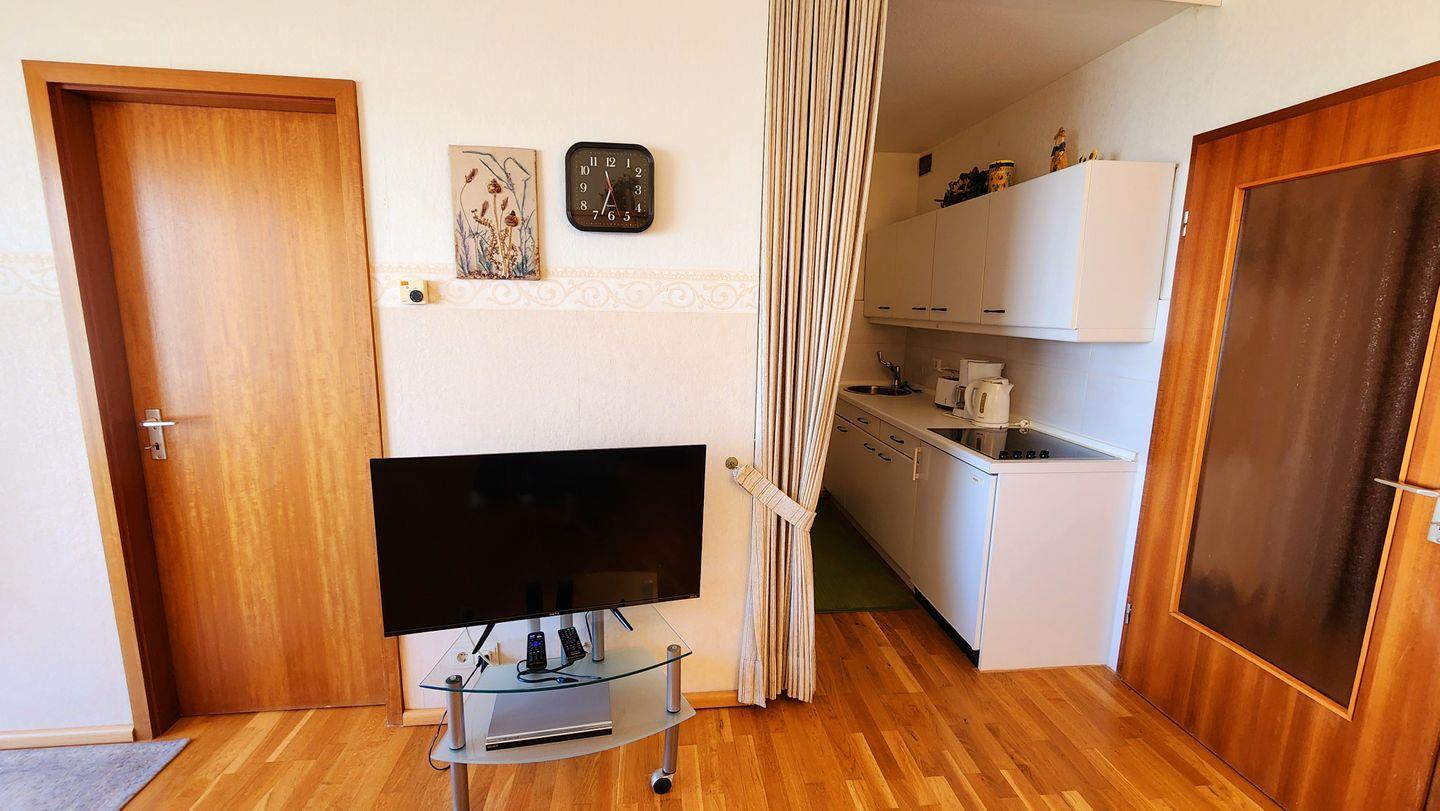 Die zum Wohnzimmer offene, zweckmäßige Küchenzeile bietet ein 4-Feld-Ceranhherd, eine Microwelle, Kühlschrank mit Gefrierfach und alle übliche Ausstattung.