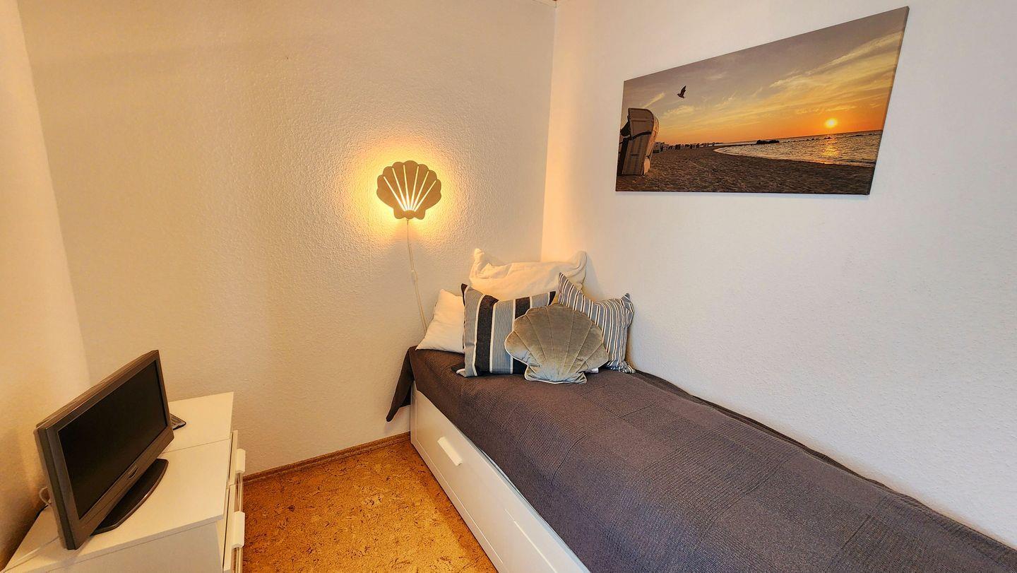 Das Kinderzimmer verfügt über eine bequeme Schlafcouch (50 x 200 cm), die sich zu einem Doppelbett (160 x 200 cm) ausziehen lässt. Auch ein zweites TV-Gerät ist hier vorhanden. Tageslichtbad mit Duschkabine, WC und großem Waschtisch. - Der Flur-,Wohn- und Essbereich ist gefliest. Das Schlafzimmer und Kinderzimmer ist mit hochwertigem Korkboden ausgelegt. Sämtliche Fenster sind mit Aussenrolläden versehen. Zudem schützt eine Markise auf dem Balkon vor zu starker Sonneneinstrahlung.