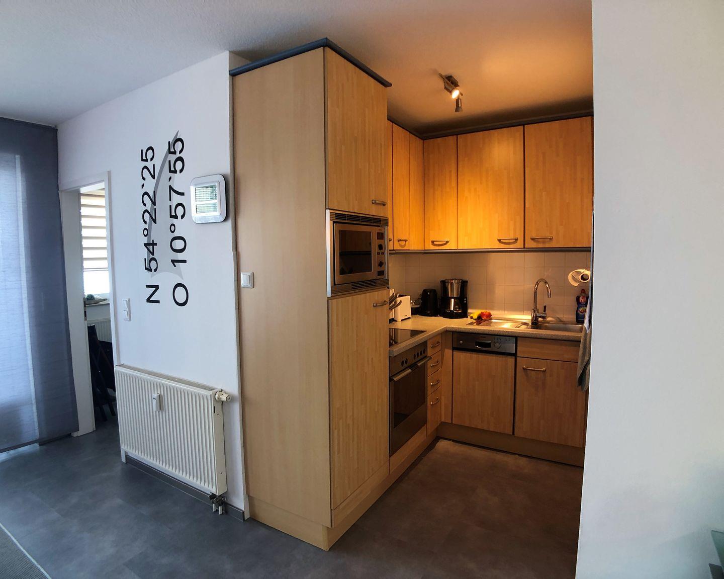 Die umfassend ausgestattete Einbauküche punktet mit 4-Feld-Ceranherd, Backofen, Microwelle, Kühlschrank mit Gefrierfach, Geschirrspülmaschine, Eierkocher und umfassender Ausstattung zum Zubereiten und Genießen.