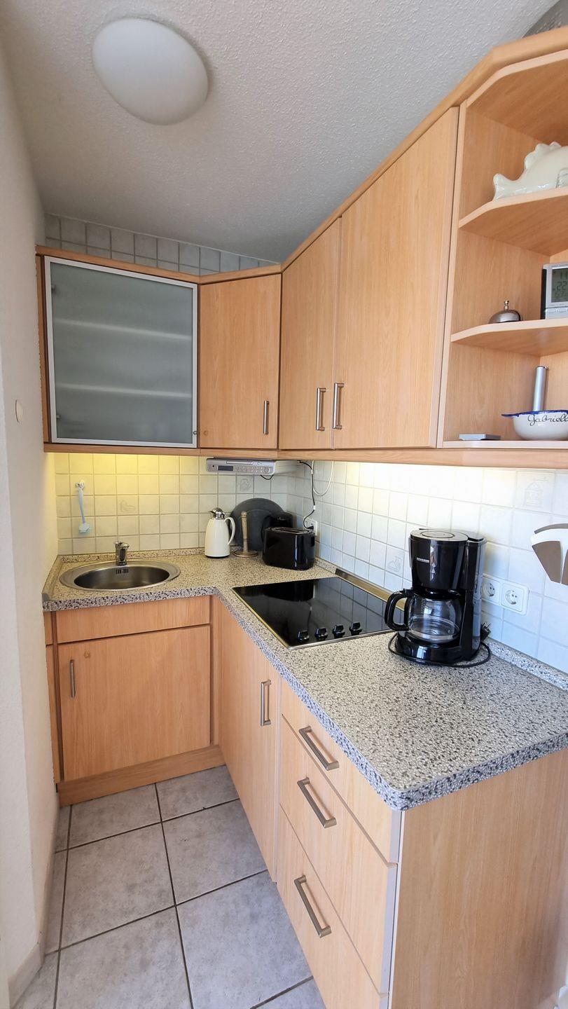 Die offene Küche mit Mikrowelle, Herd, Toaster, Wasserkocher und vielen Küchenutensilien lädt zum Zubereiten leckerer Gerichte ein.