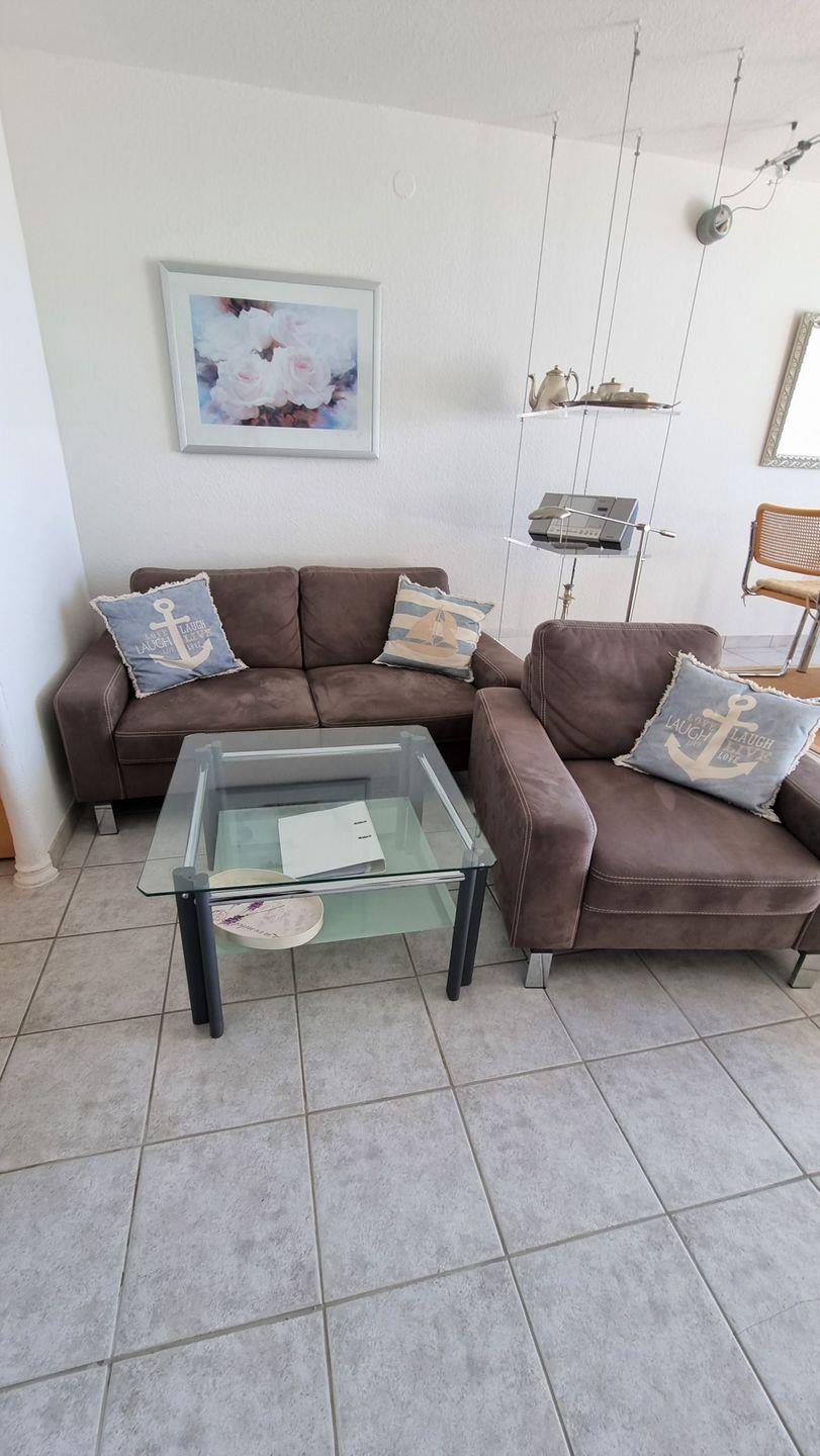 Eine gemütliche 2er Couch und ein großer Sessel (Designmöbel !) laden zum AUSRUEHN ein. Der integrierte Showkamin sorgt weiterhin für Gemütlichkeit (nur Deko!).
