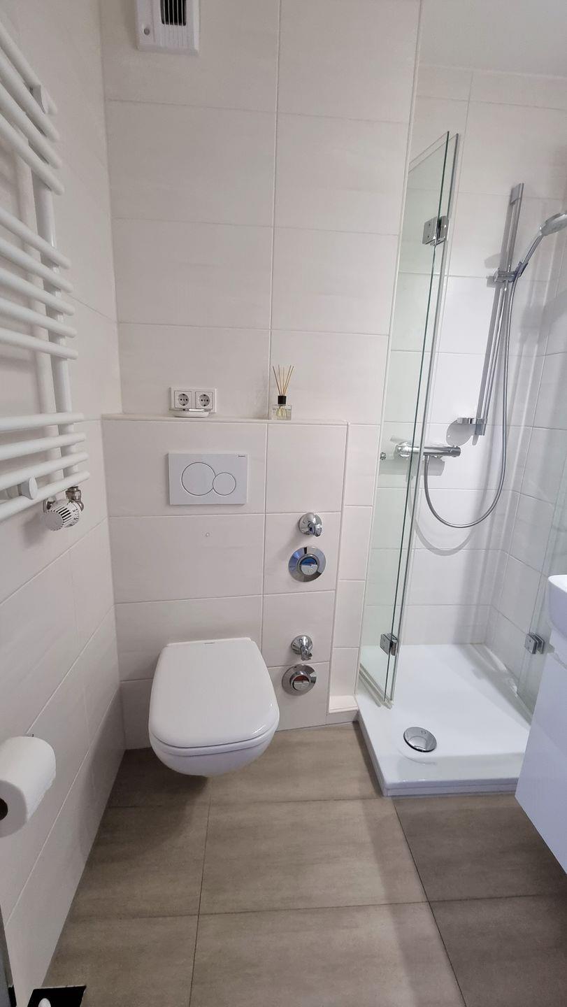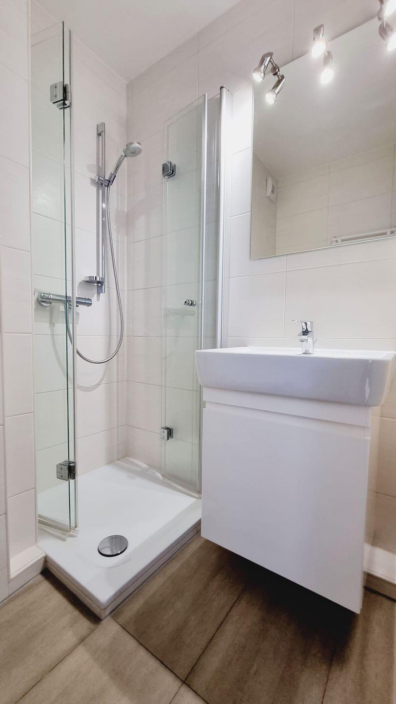 Das helle Badezimmer wurde aufwendig saniert und verfügt nun über eine moderne und wertige Glasduschkabine (flacher Einstieg) ; Hänge-WC und Waschtisch.