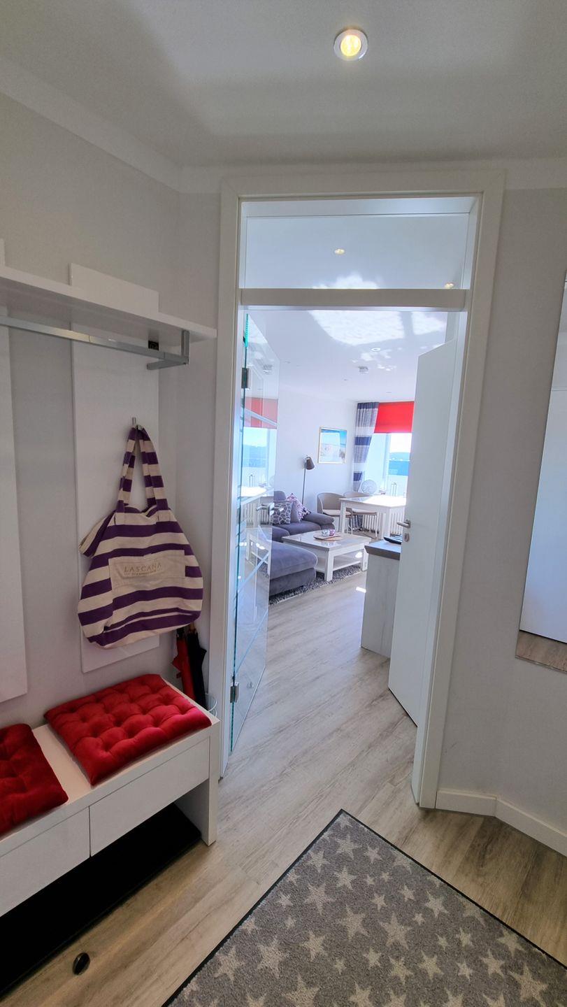 Der Eingangsbereich ist hell und freundlich eingerichtet und bietet viel Platz für Garderobe.