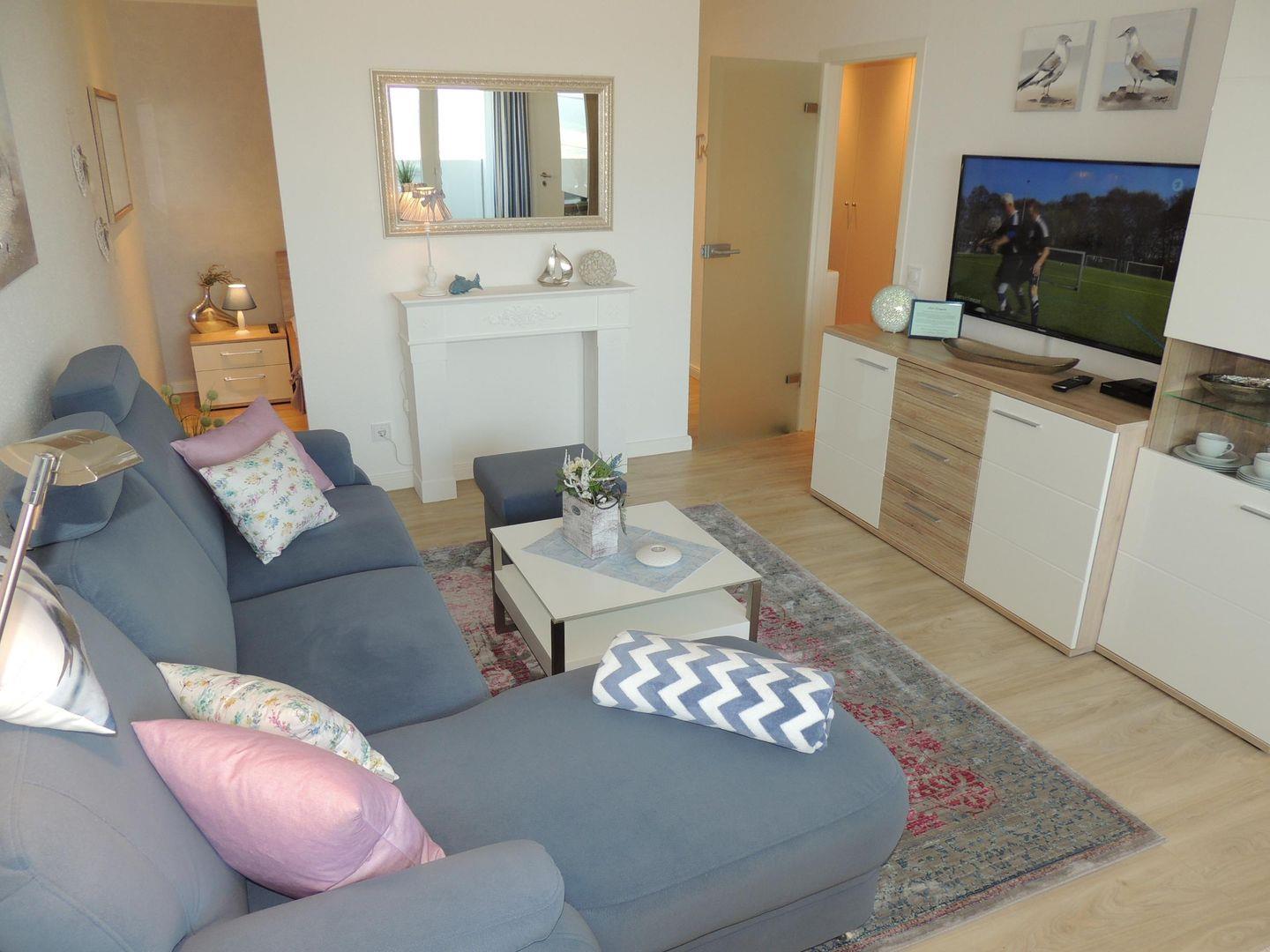 Der helle Wohnbereich verfügt über eine komfortable Couchgarnitur mit Ottomane, einen 49" -LCD-TV, eine HiFi-Anlage und Radio mit CD-Player.