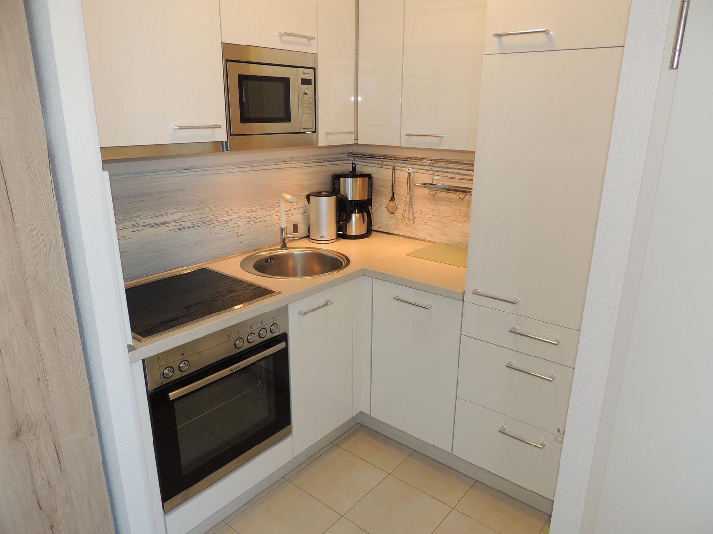 Die moderne und gut ausgestattete Einbauküche mit 4er-Cerankochfeld, Mikrowelle, Backofen und Geschirrspüler lässt keine Wünsche offen.