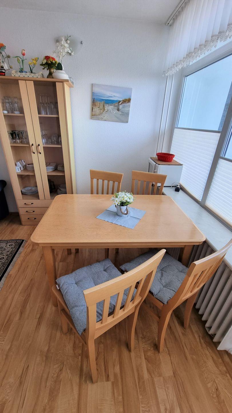 Sie haben Ostseeblick Richtung Steinwarder und Insel Fehmarn. Wohnraum mit einer modernen Eckcouch, Flachbildschirm und Radio. Die Essecke befindet sich am Fenster. Der Schlafbereich ist mit einem Doppelbett (180x200cm) ausgestattet und durch eine Wand mit Fenster separat vom Wohnbereich abgetrennt. Kinderzimmer mit neuen Etagenbett (90x200cm). Küche mit 4-Plattenherd und Mikrowelle. Renoviertes Bad mit Kabine, DU/WC.