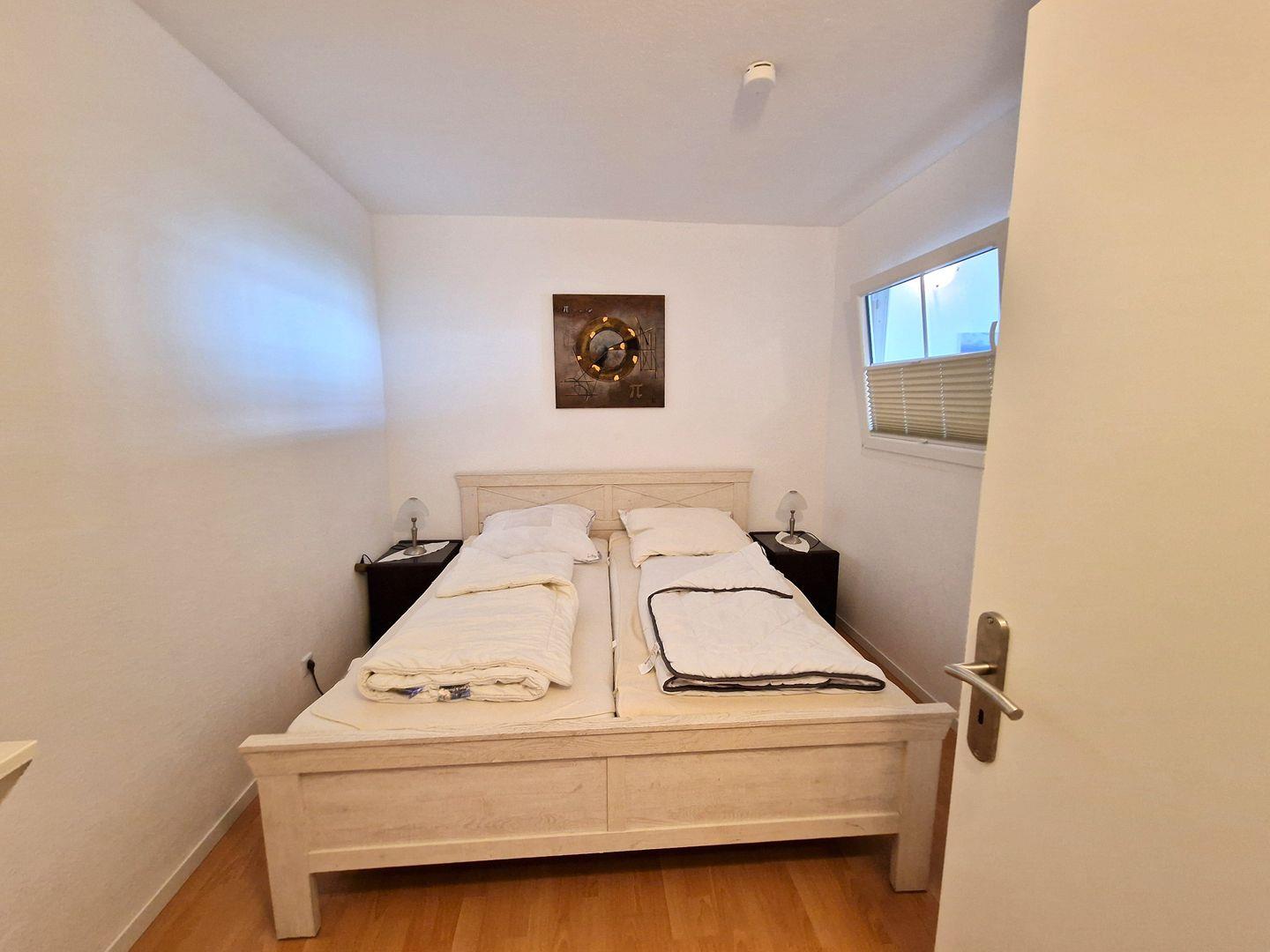Das separate Schlafzimmer mit Doppelbett wurde ebenfalls hell und freundlich eingerichtet und ist vom Flur aus zugänglich. Hier befindet sich ein Doppelbett.