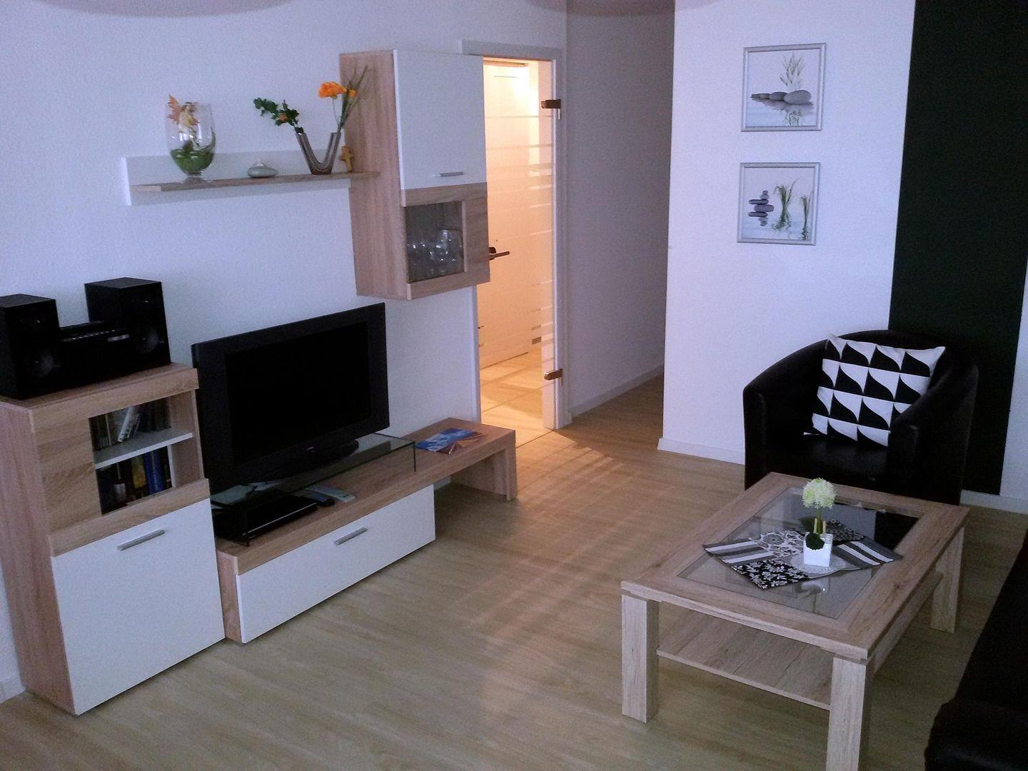 Der helle und moderne Wohnbereich ist ausgestattet mit einer gemütlichen Couch mit Ottomane sowie einem Hocker. Flachbild-TV, DVD-Player und ein CD-Player inkl. USB-Anschluss sind ebenfalls gegeben. Die gemütliche Essecke befindet sich am Fenster.