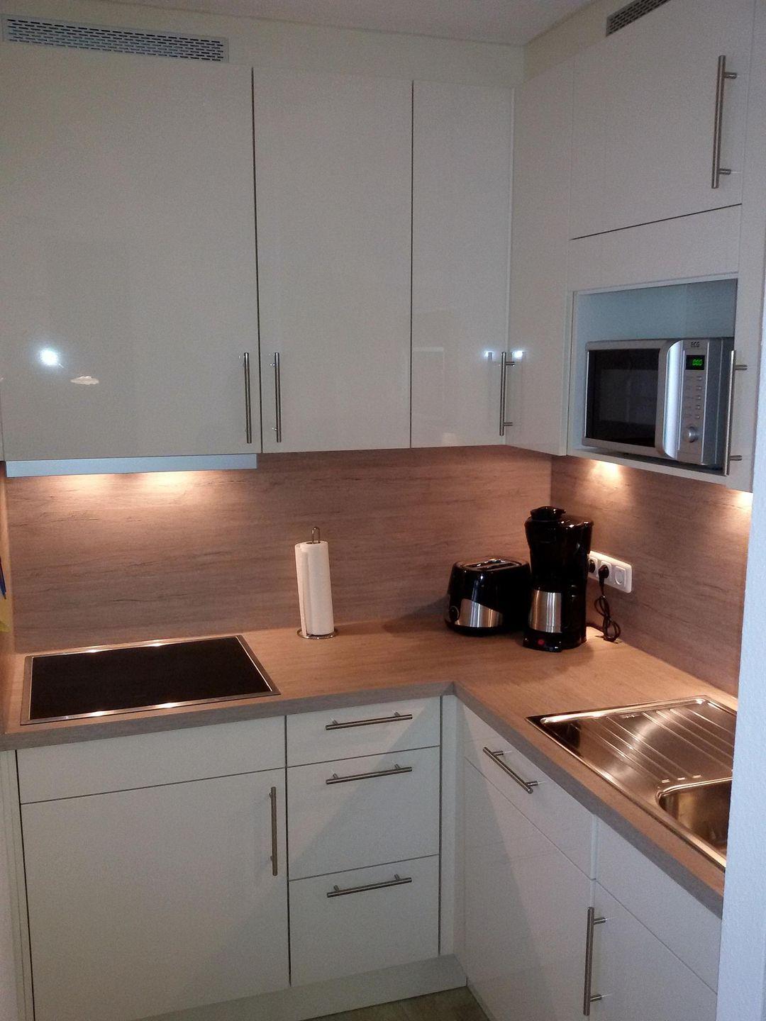 Hochglänzende Einbauküche mit 4er-Ceranfeld, Mikrowelle mit Grillfunktion, Geschirrspüler, Wasserkocher, Kaffeemaschine, Mixer, Toaster und Eierkocher.