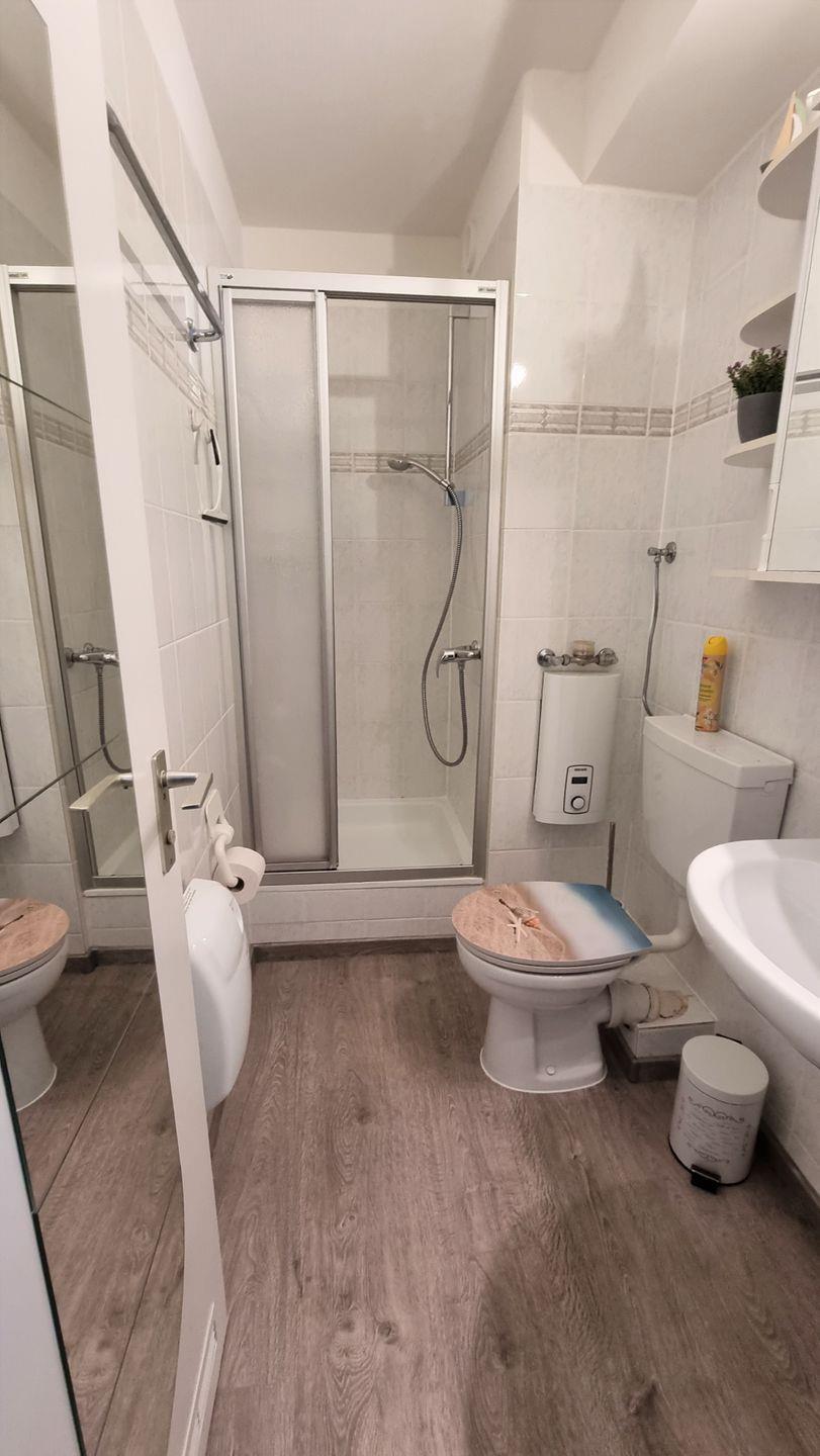 Das helle Bad verfügt über ein WC, eine Duschkabine sowie einen beleuchteten Spiegelschrank.
