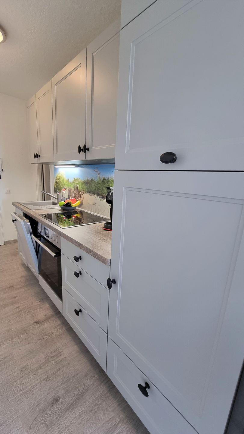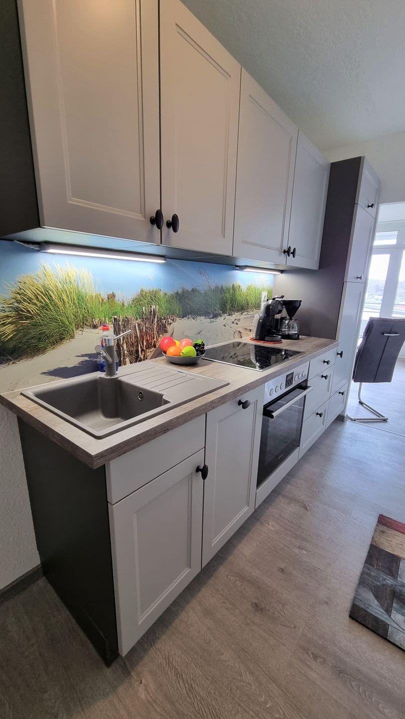 Küchenzeile mit Backofen, Ceranfeld, Mikrowelle, Spülmaschine, Filter-Kaffeemaschine sowie "Dolce Gusto" Kapsel-Kaffeemaschine.