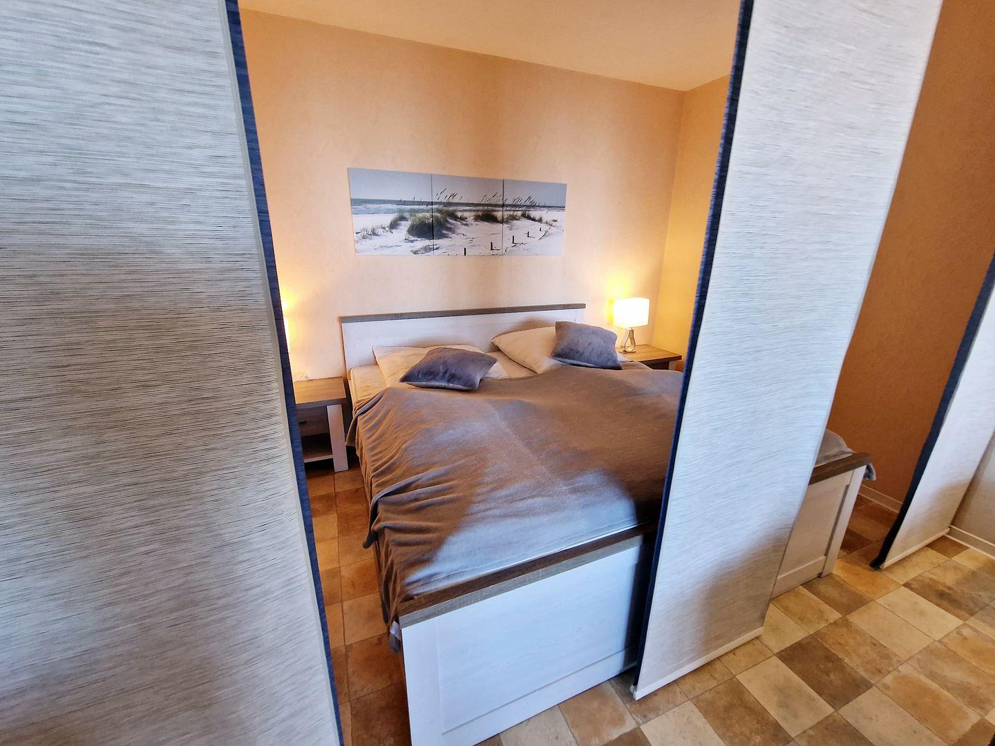 Der Schlafbereich mit Doppelbett ist durch einen Vorhang abgetrennt.