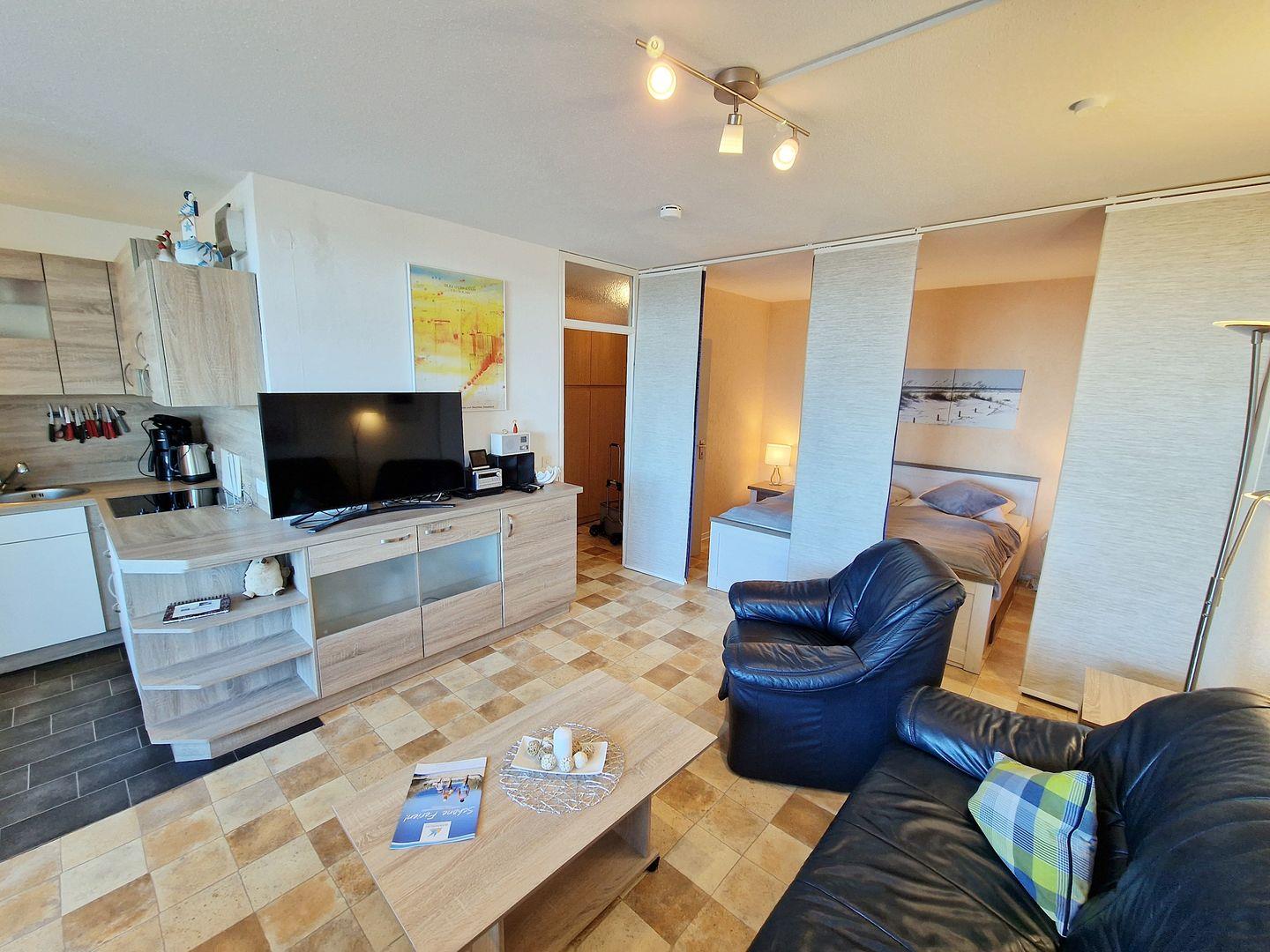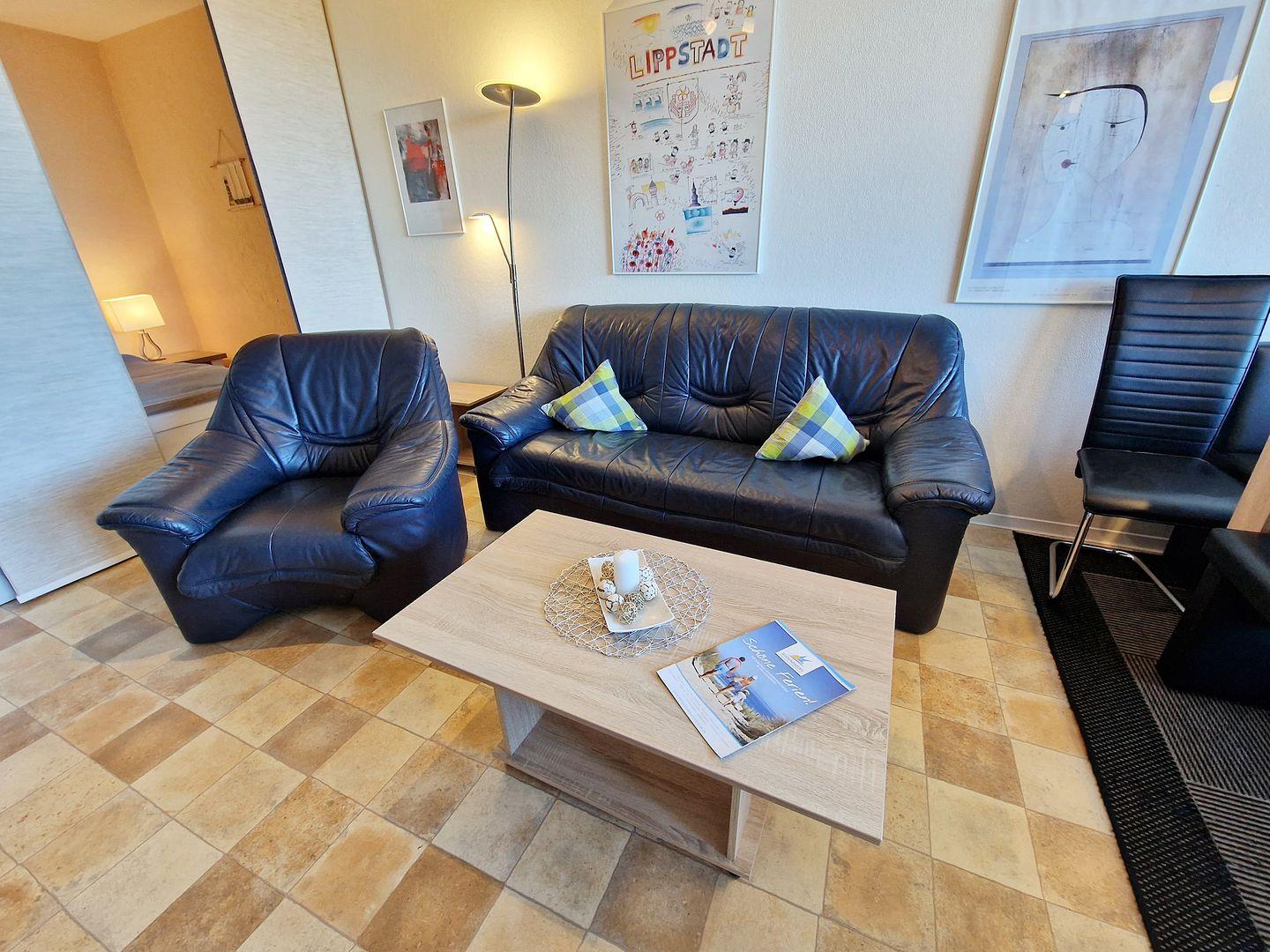 Der Wohnraum ist mit einer dunkelblauen Ledergarnitur ausgestattet. Auf einem Sideboard befinden sich ein LCD-TV (81cm), ein DVD-Player und ein Radio mit CD-Player.